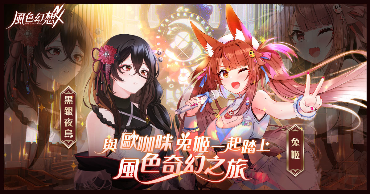 《風色幻想 NeXus》深度結合知名國產遊戲 IP 與台灣十位超人氣 VTuber,遊戲自上市以來相繼推出了「子午計畫」的「KSP」、「汐 Seki」、「浠 Mizuki」、「響 Hibiki」,「箱箱 The Box」的「森森鈴蘭」、「瑪格麗特」以及「MiroLive」的「塔芭絲可」、個人勢「杏仁ミル」等多位 VTuber 角色。本次更新超人氣 VTuber「兔姬」與「黑銀夜烏」性感登場,攜手玩家共闖風色世界!