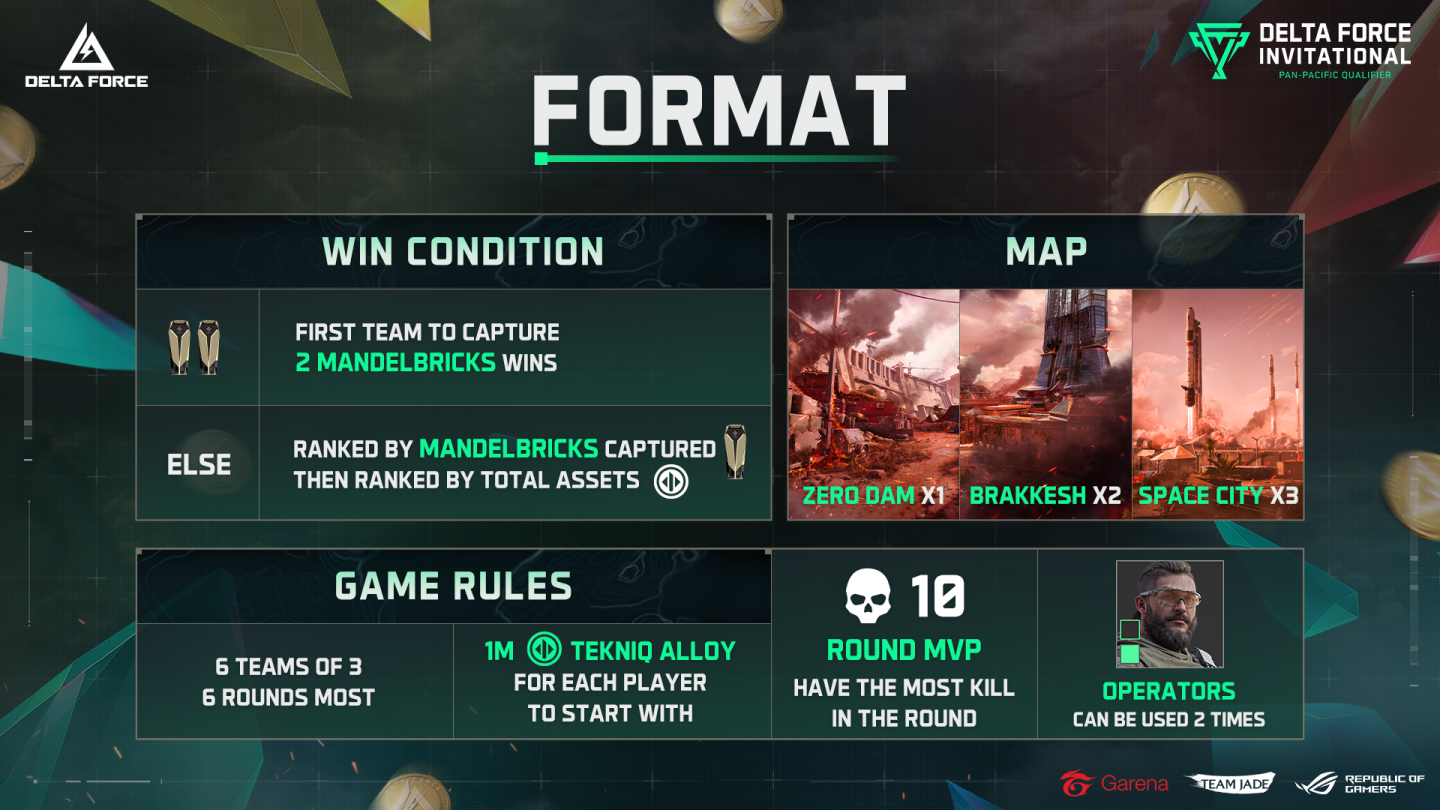 本屆泛太平洋賽區資格賽採用與《三角洲行動》烽火世界盃線下總決賽相同的賽制,於《三角洲行動》主模式之一的「烽火地帶」中進行對戰。比賽為 BO6 制,最先贏得 2 個曼德爾磚的隊伍即可封關奪冠;若六局結束仍無隊伍達成條件,則依據六局累積資產判定勝負。角色選擇方面,每名角色最多只能出場兩次,考驗選手角色池與隊伍策略。
