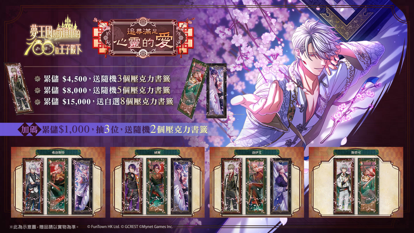 夢谷購物中心開啟超優惠儲值活動,超值禮包販售中!累計儲值達指定金額可獲得愛情突破教育員、10 連召喚券、★5(含 SP)王子自選券等好禮,請公主千萬不要錯過!本檔加碼送實體壓克力書籤,總計 11 款等你收藏!
