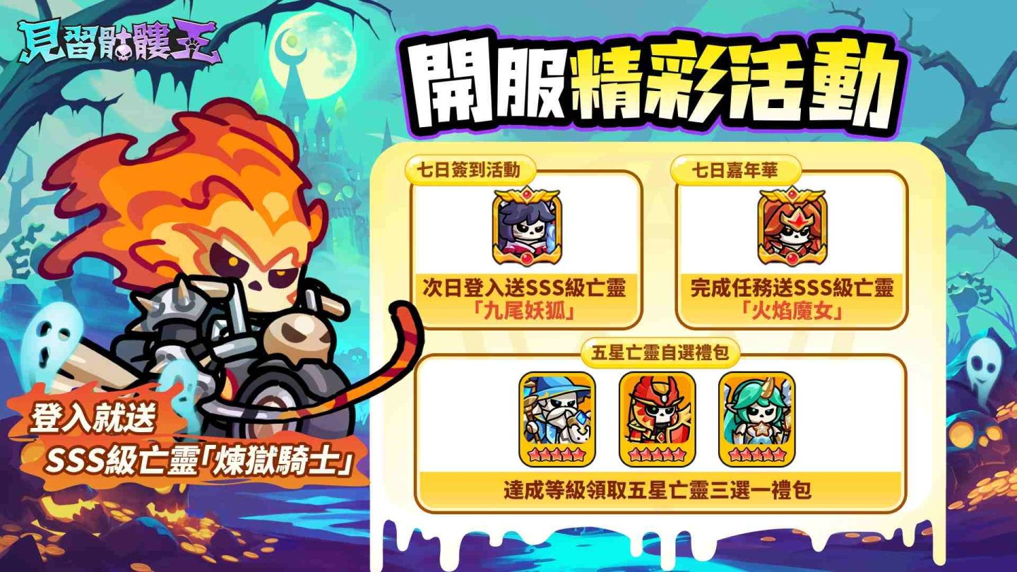 .七日嘉年華:完成每日任務、闖關挑戰、資源收集等行動,不僅可獲得大量強化素材與稀有道具,還可免費領取 SSS 級亡靈「火焰魔女」,助你開局迅速擴展戰力。