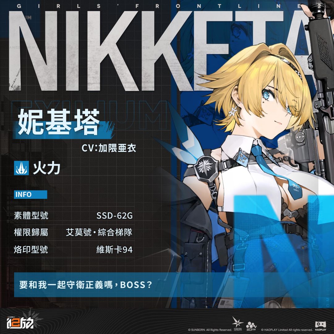 妮基塔是堅持正義的治安人員、愛護孩子的溫柔姐姐、花錢不眨眼的月光族——誰說這些身份不能是同一個人?奮戰於守護正義的一線,妮基塔冷靜地踐行著自己的原則,但在面對你時,她也會流露出特別的一面。