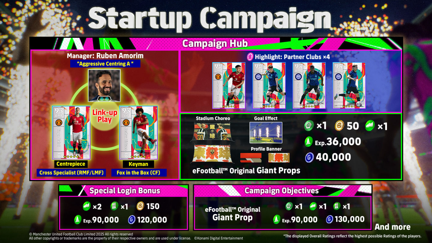 玩家可透過「活動中心」、「特別登入獎勵」、「活動成就」等多項遊戲內活動,獲得包括可用於簽下新球員的《eFootball》金幣、培育球員的訓練道具、EXP 及 GP 等等豐富獎勵。