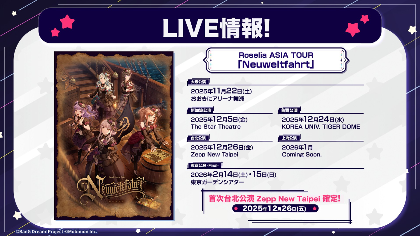 手機遊戲與動畫《BanG Dream!》中登場的少女樂團「Roselia」宣布亞洲巡迴「Neuweltfahrt」將納入台北站,也將是首次在台灣舉辦的單獨公演,預計於 2025 年 12 月 26 日(星期五)在新莊 Zepp New Taipei 舉行,主辦單位數位至匯Digital YoHo宣布入場資格將採實名抽選制購票。