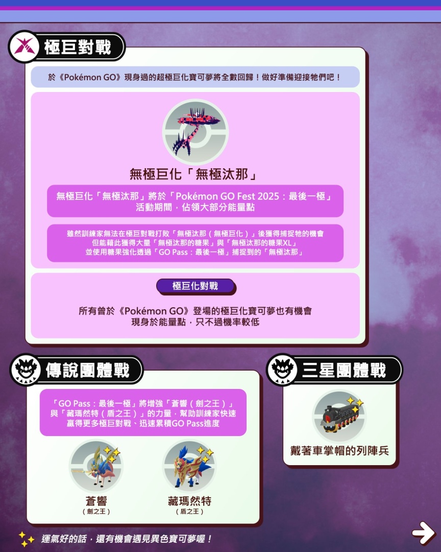本次「Pokémon GO Fest 2025:最後一極」活動的主角寶可夢為無極巨化「無極汰那」與「蒼響(劍之王)」、「藏瑪然特(盾之王)」。活動期間,除了無極巨化「無極汰那」將會佔領大部分能量點。玩家打敗牠後雖然無法捕捉,不過卻可以獲得大量「無極汰那」的糖果,並可以使用這些糖果來強化在「最後一極」活動中捉到的無極汰那。