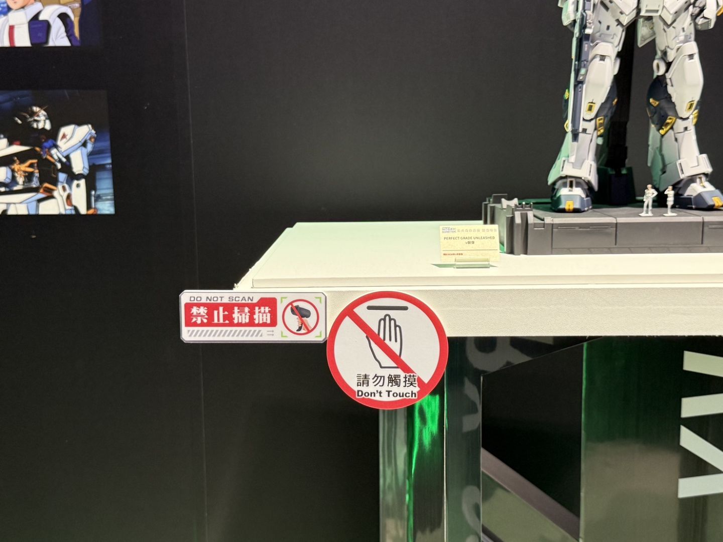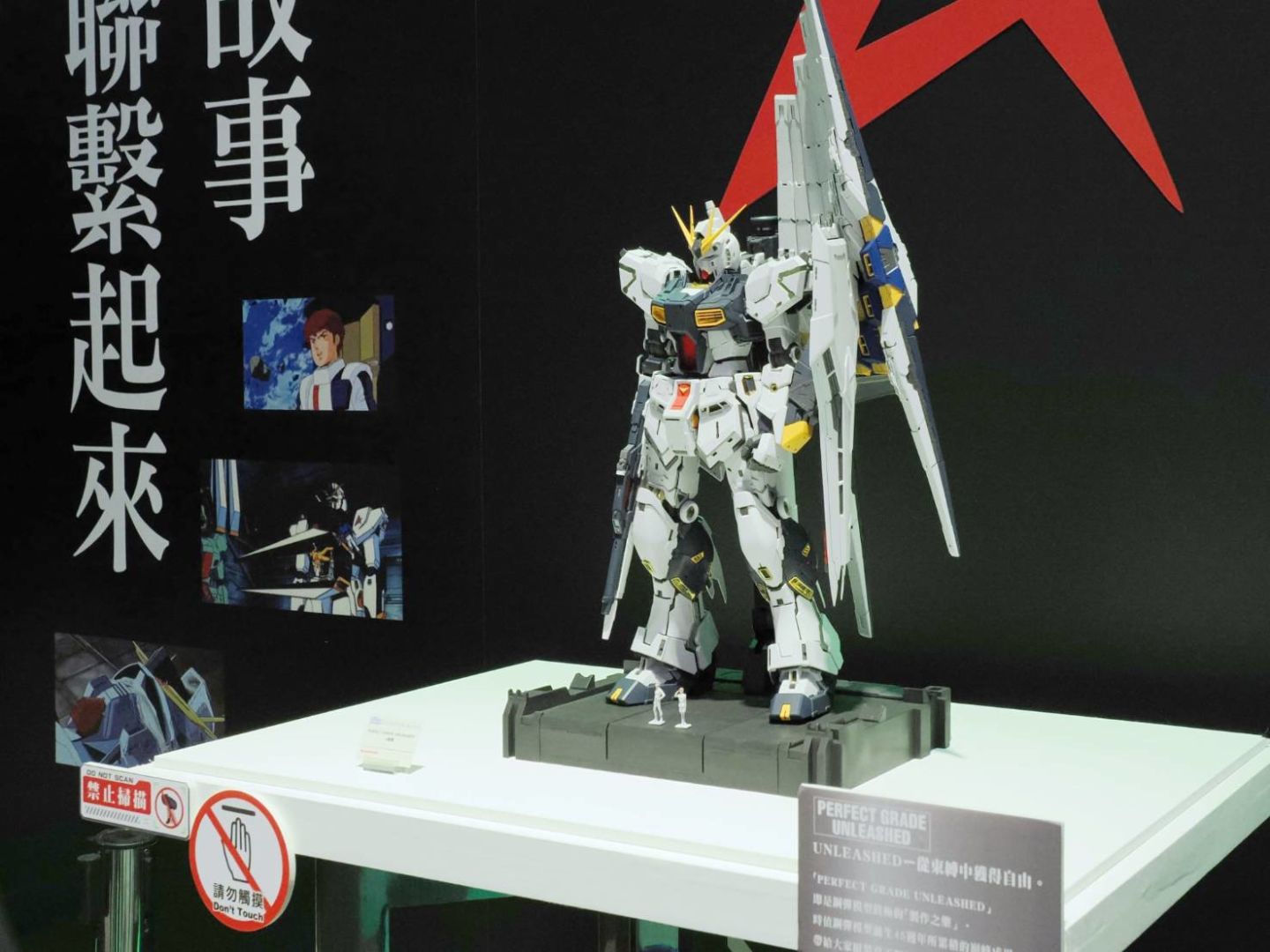 在特展中重磅登場的「鋼彈模型區」,展出了多款重量級紀念作品 。其中,為紀念鋼彈45週年而推出的PG UNLEASHED ν鋼彈為首度在台登台亮相 。鑑於先前於上海展示發生的掃描事件,今日展出的 PG UNLEASHED ν鋼彈也特別放上「禁止掃描」的告示。