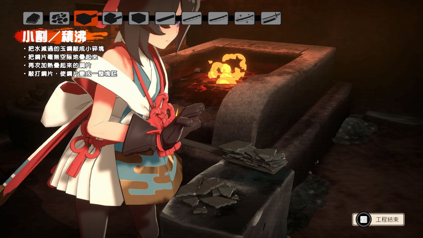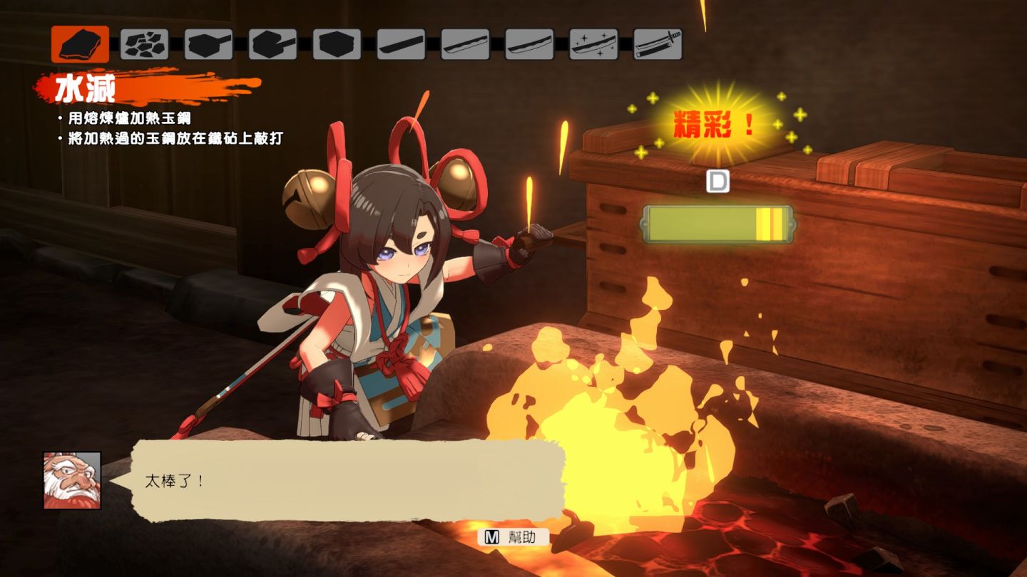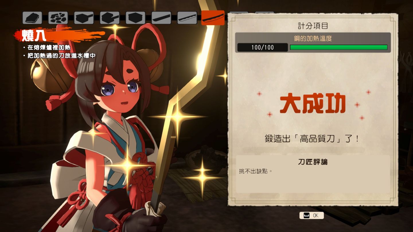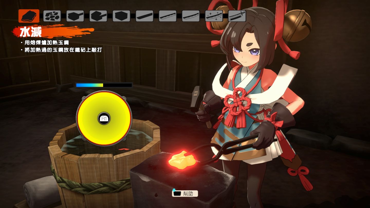 但特別的是,本作仿照了真實鍛刀過程打造的眾多小遊戲集合「鍛刀」八步驟機制。在村莊的鍛冶場處,玩家將親手操作永久,為擔任劍役的夥伴們打造武器,鍛刀需要使用在冒險中獲得的「玉鋼」與「刀魂」兩種素材。