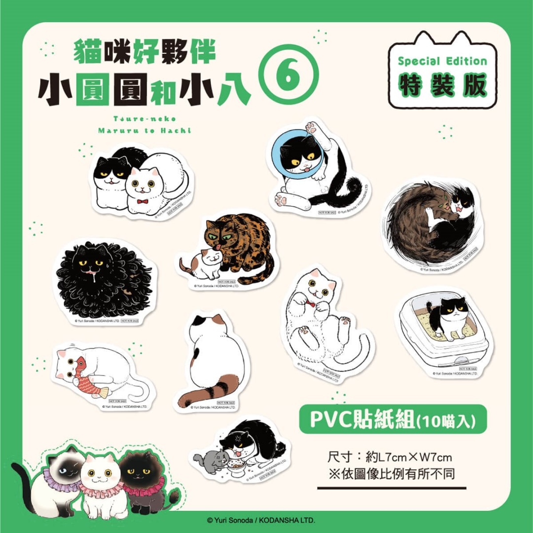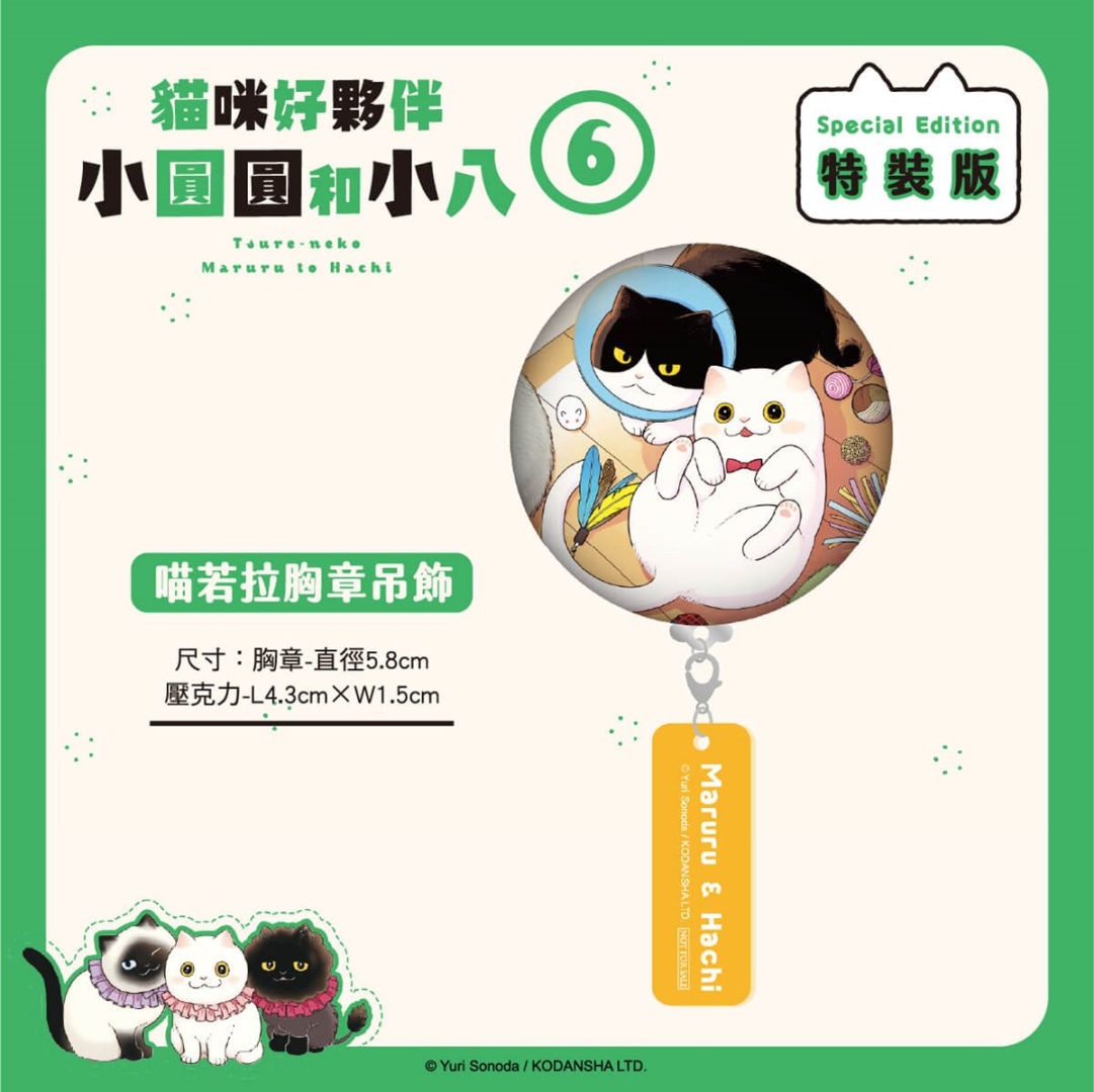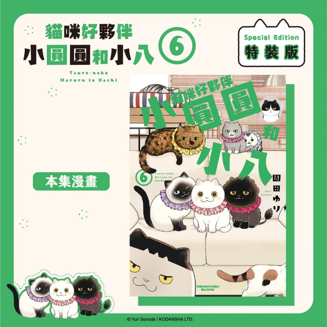 《貓咪好夥伴小圓圓和小八 (6)》萌喵特裝版獨家收錄多款特典──「喵若拉胸章吊飾」、「萌喵PVC貼紙組」跟「第六集漫畫」收錄於「特裝版透明書盒」。即日起可至全台書店進行預購──指定通路、台灣角川官網;期間於台灣角川官網完成預購,再加碼贈送官網專屬購物金 100 元!請讀者朋友務必把握事前限期預購機會以免向隅。