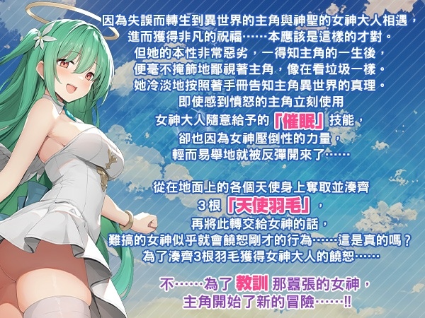 本作講述被卡車撞的主角意外(?)穿越到異世界,並即將接受女神大人的祝福,然而當他講述完如尼特般的一生後,女神竟用看垃圾一樣的眼神鄙視他!?女神隨意給予了「催眠」技能,即使主角立刻使用也被女神的力量反彈開來…不行!不能就這麼算了!為了教訓那囂張的女神,主角展開異世界大冒險,招募(催眠)夥伴,決心要向女神復仇!