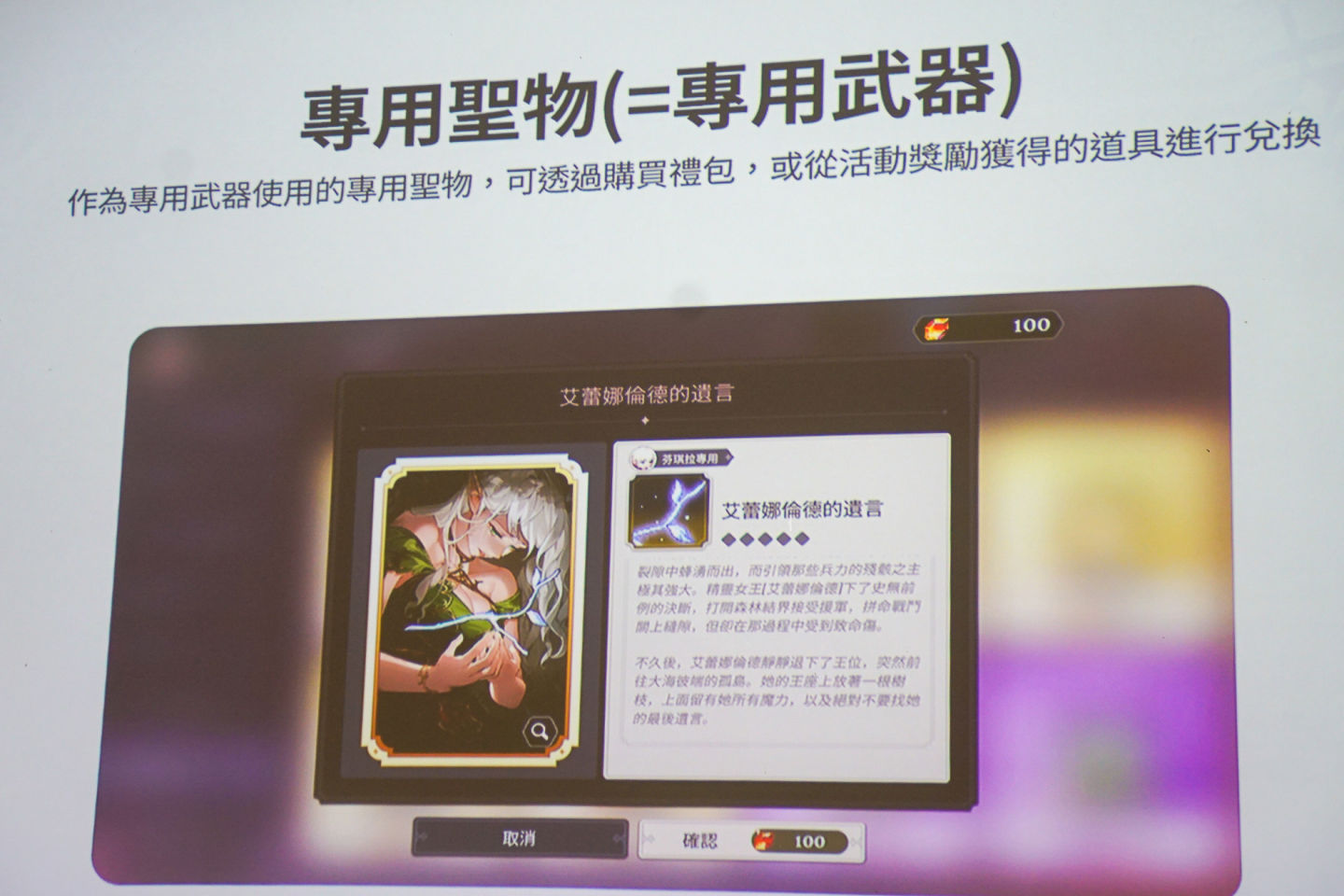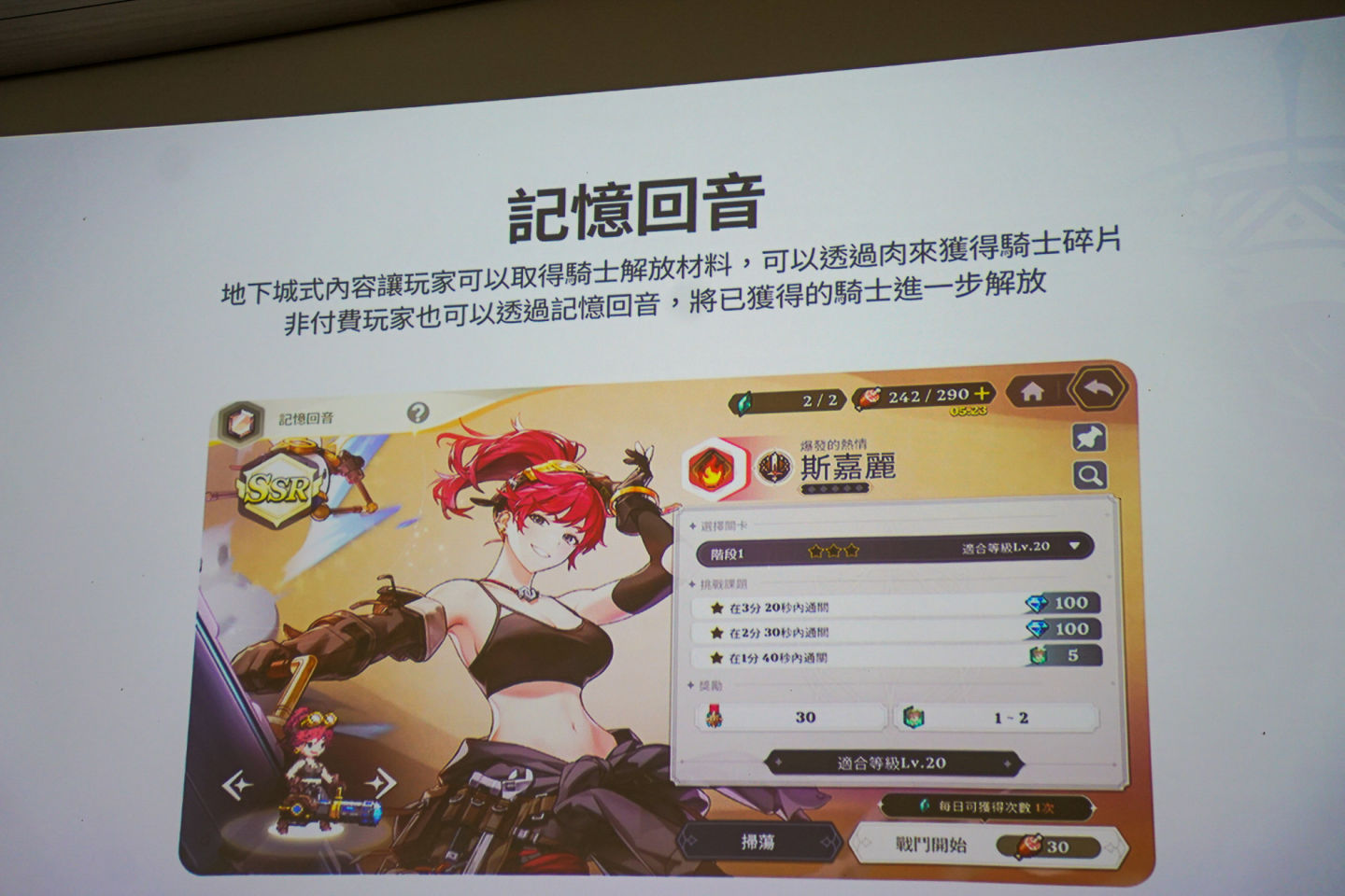 在課金與養成系統上,無課玩家可以利用記憶的迴響,有「鑰匙」每天都能穩定獲得騎士碎片,最終可以獲得並完全解放該騎士角色。而專用聖物(專武)則是將該騎士能力最大化的必備道具。但官方認為如果連專武的獲取都充滿不確定性,會對遊玩造成太大的壓力。因此專武是可以透過活動獲得的道具來兌換,或是用固定的價格來購買,而不是只能透過轉蛋的方式。