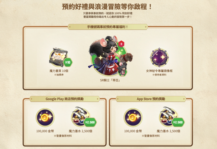 《Goddess Order女神秘令》已在四個國家進行試營運,並進入最終階段,預計於 9 月正式全球上市,支援包含繁體中文在內的六種語言。全球事前預約活動正火熱進行中,參與預約的玩家將可獲得 SR 等級角色「蒂亞」、專屬「Order 頭像框」與「魔力書頁 10 張」等豐富獎勵,透過 App Store 或 Google Play 預約還可額外獲得「10 萬金幣」與「2,500 魔力墨水」。