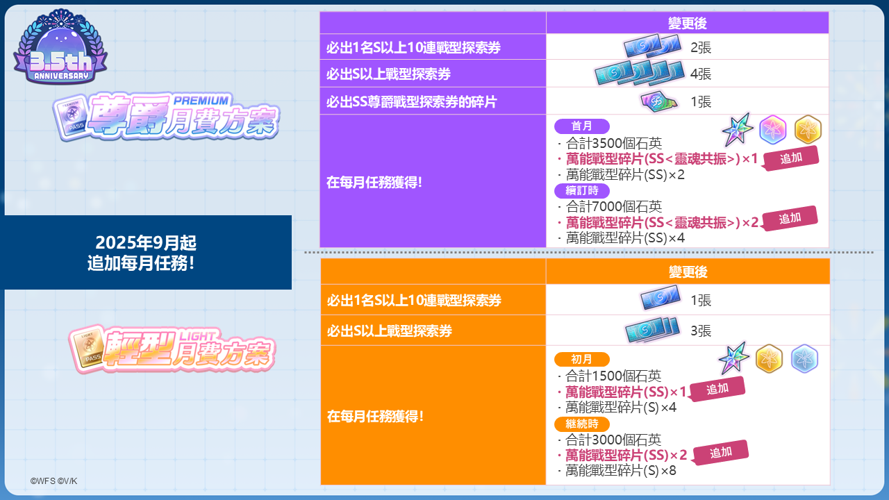 .輕型方案:「獲得萬能戰型碎片(SS)×1」※續訂時2倍
