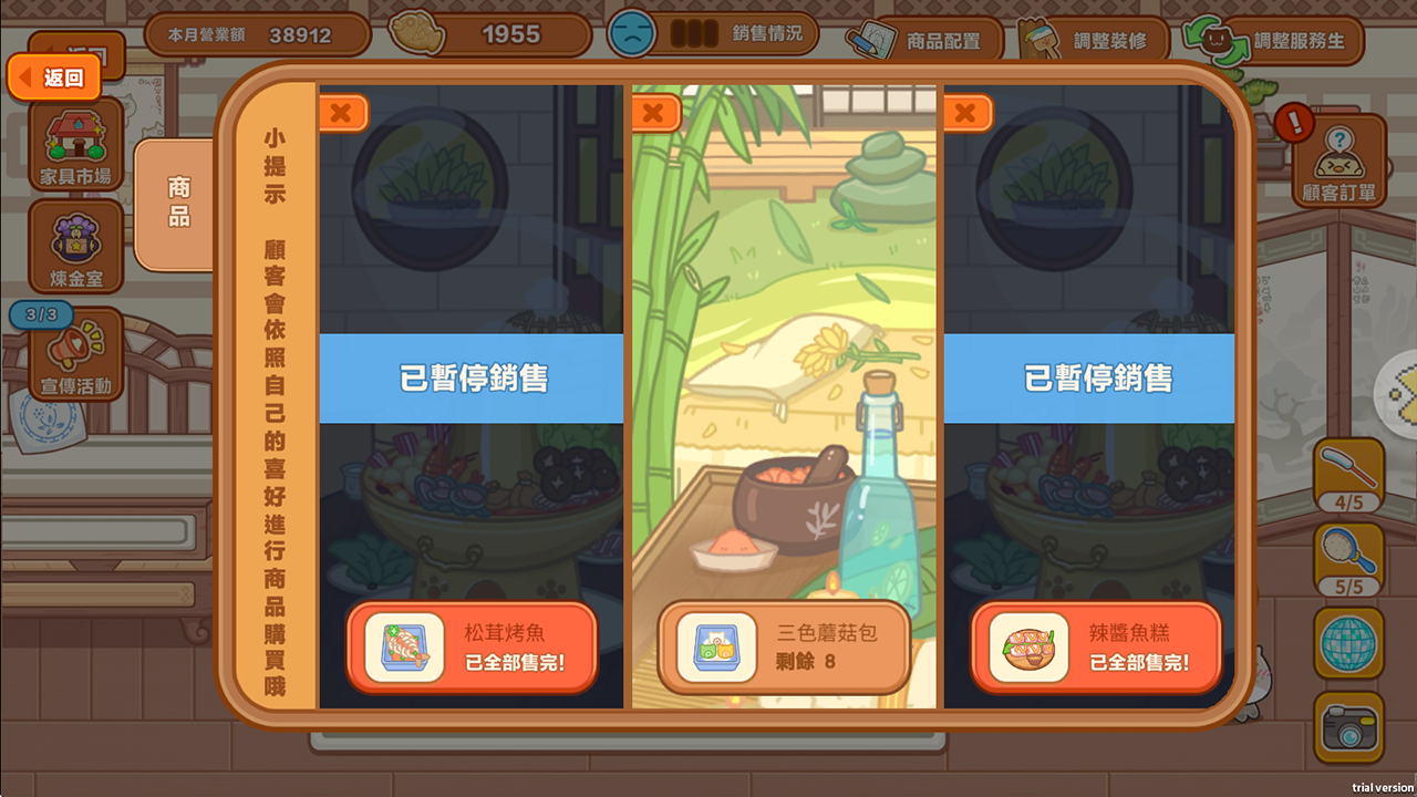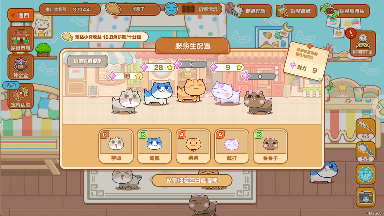 為了獲得更多小魚乾,玩家需收集材料研發料理、升級菜色,並依照顧客需求調整菜單。用心經營才能有效提升銷售量與營業額!