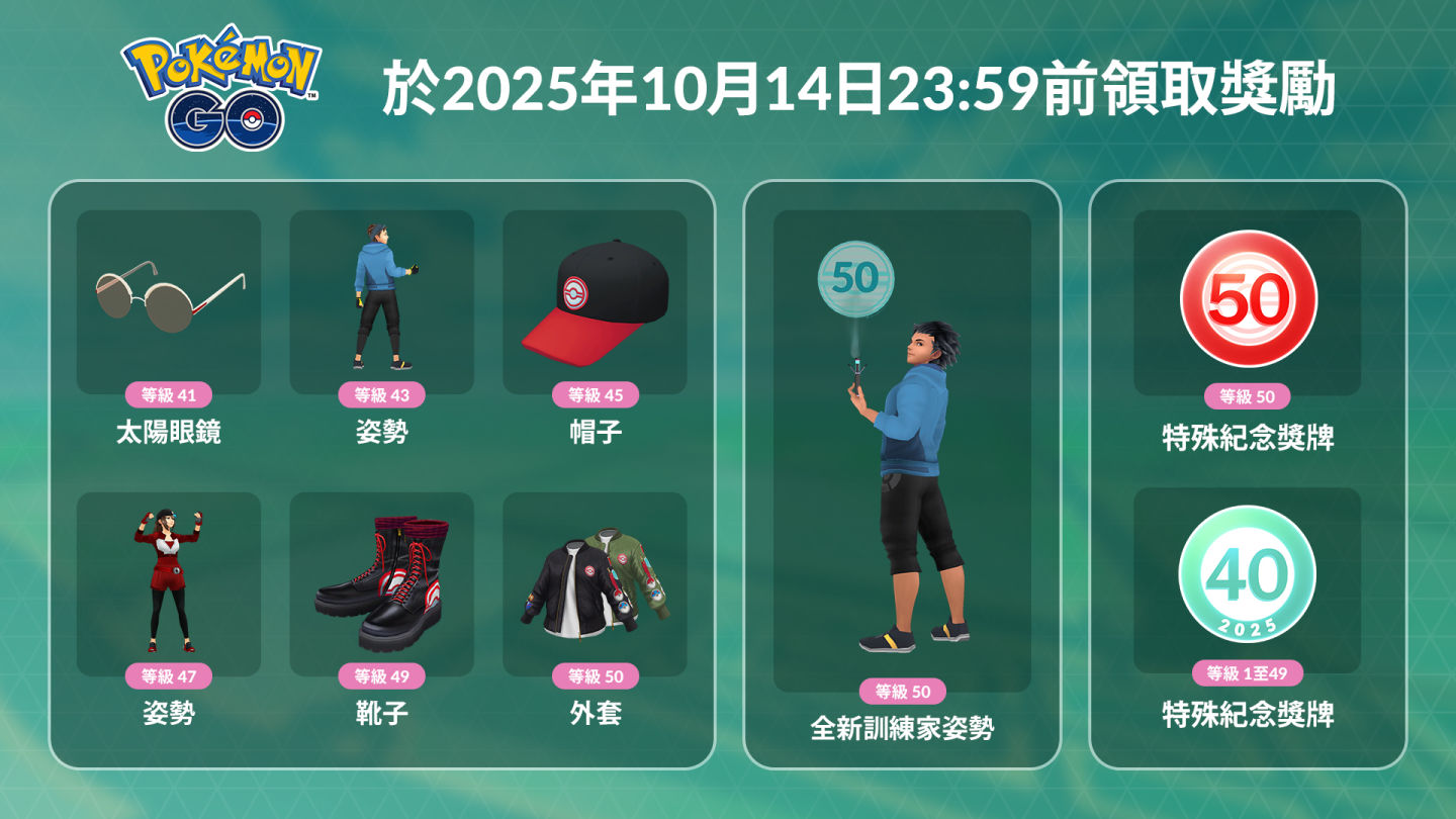 另外,台灣時間 2025 年 10 月 14 日 23:59 前,所有玩家將獲得 1 枚特殊獎牌,以紀念各位達成的最高等級(等級 1 至 50)。此外,50 級的訓練家將獲得「等級 50 外套」與 1 個全新訓練家姿勢,紀念訓練家達成的成就。