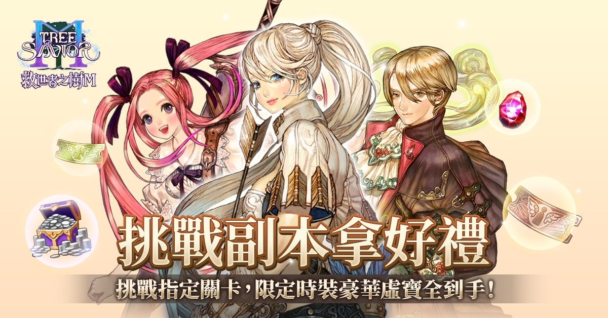 為慶祝台港澳上市,推出「上市見面禮」、「上市簽到」及「挑戰副本」等三大開服活動,邀請玩家即刻加入冒險。只要登入即送 UR 隨行者招募箱與超萌限定表情貼,更可透過簽到與挑戰任務,獲得造型時裝與經典坐騎。同時,更釋出三支由「柴犬七仙女」的「大冰奶」與「荷包蛋」主演的萌系宣傳影片,以滿滿療癒力陪伴玩家展開《救世者之樹M》可愛冒險。