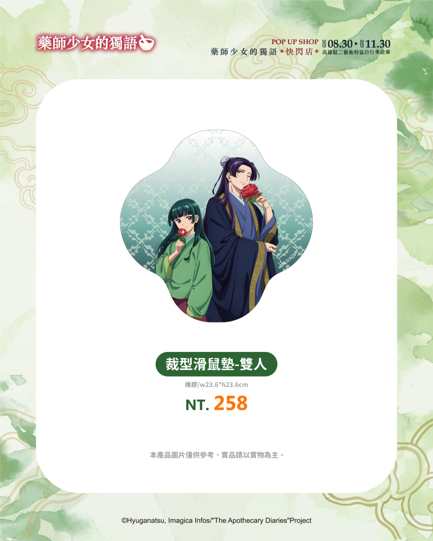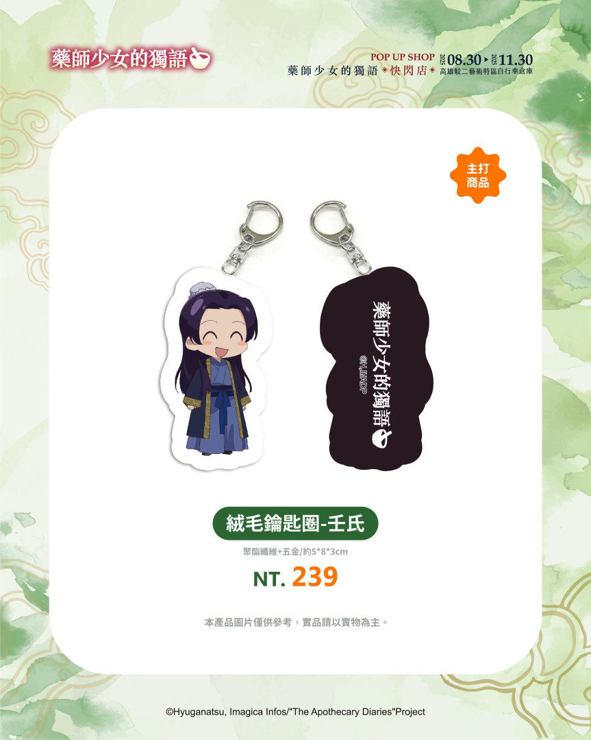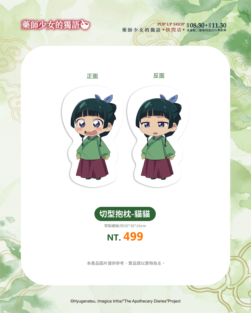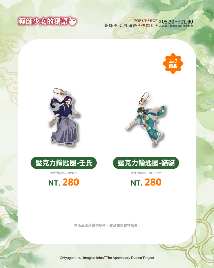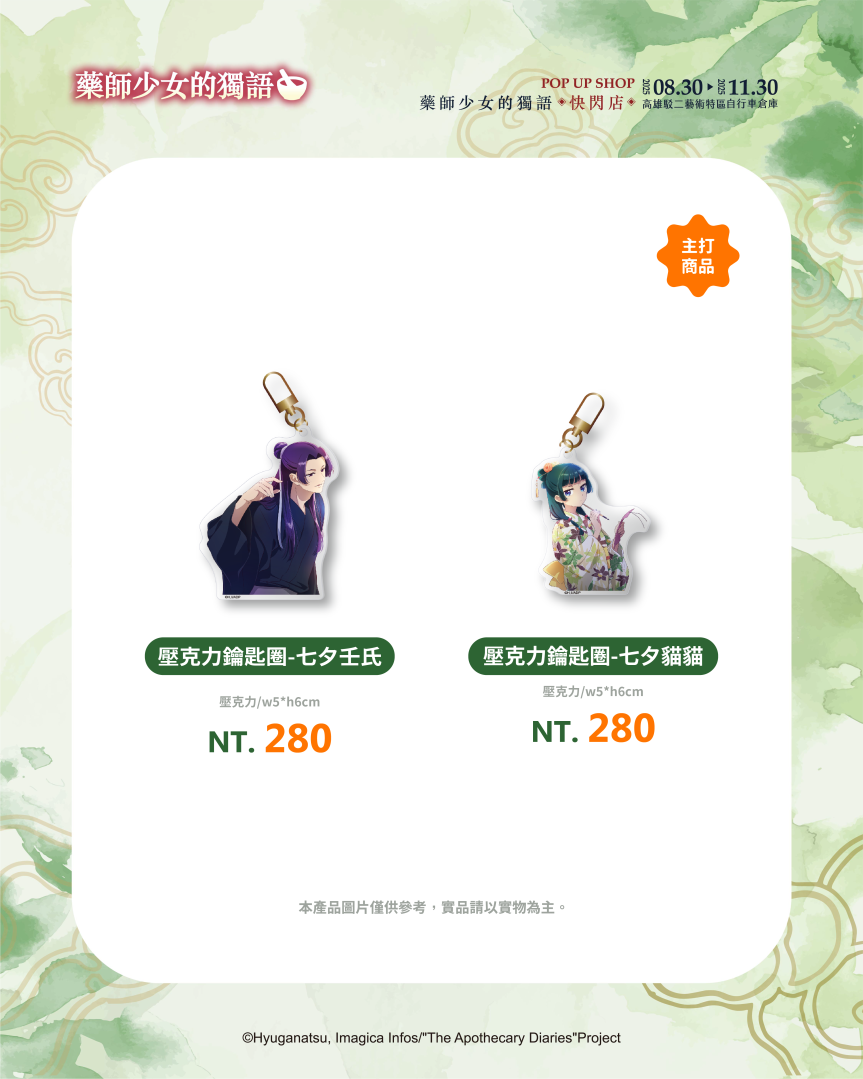 不僅有沉浸式的展區體驗,《藥師少女的獨語》快閃店更推出超過百款全新周邊商品,帶來視覺與收藏的雙重驚喜。從各種服裝造型與Q版設計,到貓貓與壬氏之間的甜蜜互動圖像,都化作不同形式的商品呈現!