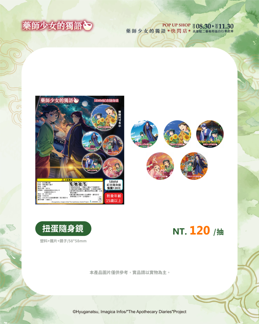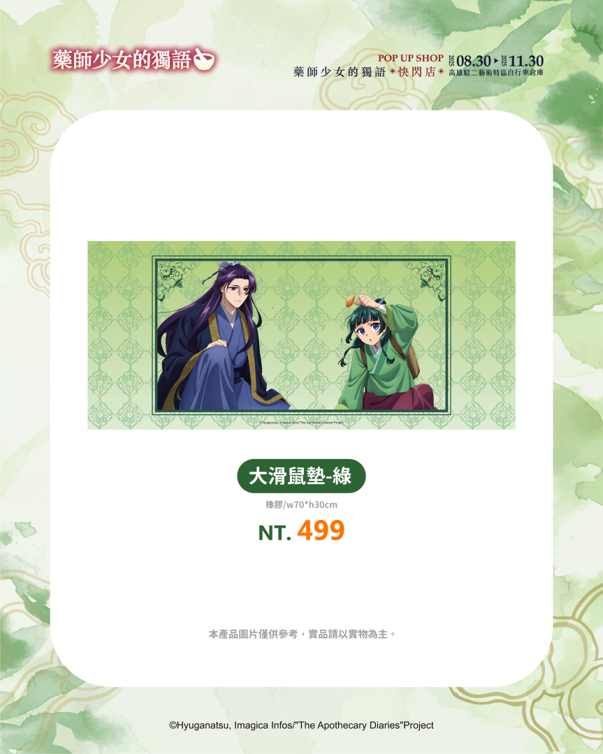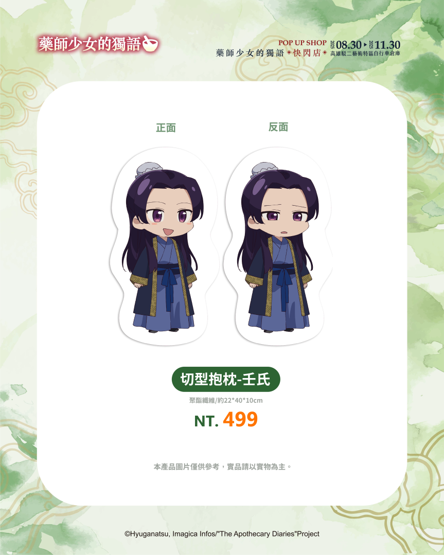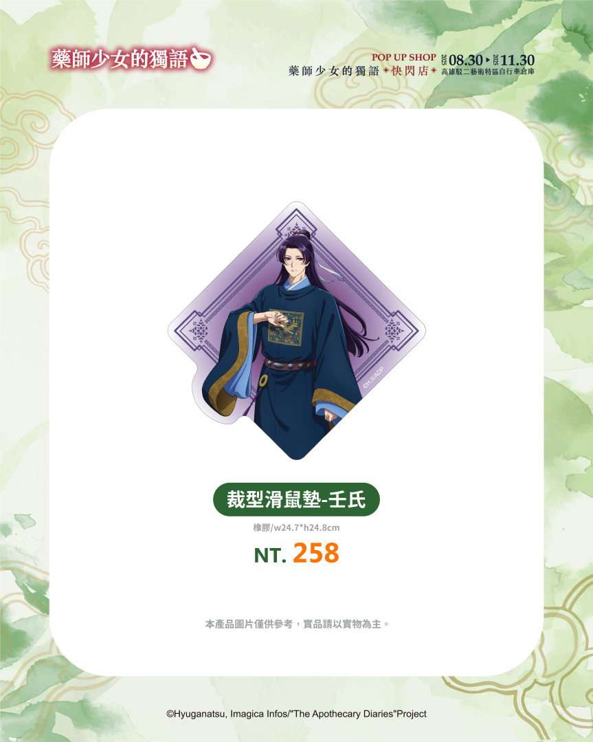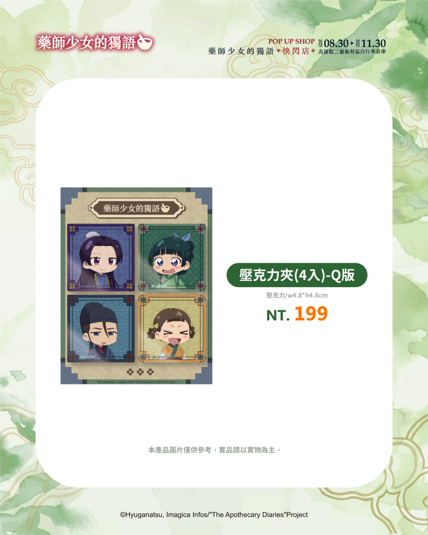 不僅有沉浸式的展區體驗,《藥師少女的獨語》快閃店更推出超過百款全新周邊商品,帶來視覺與收藏的雙重驚喜。從各種服裝造型與Q版設計,到貓貓與壬氏之間的甜蜜互動圖像,都化作不同形式的商品呈現!