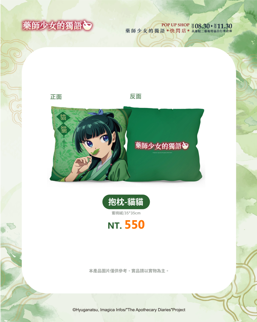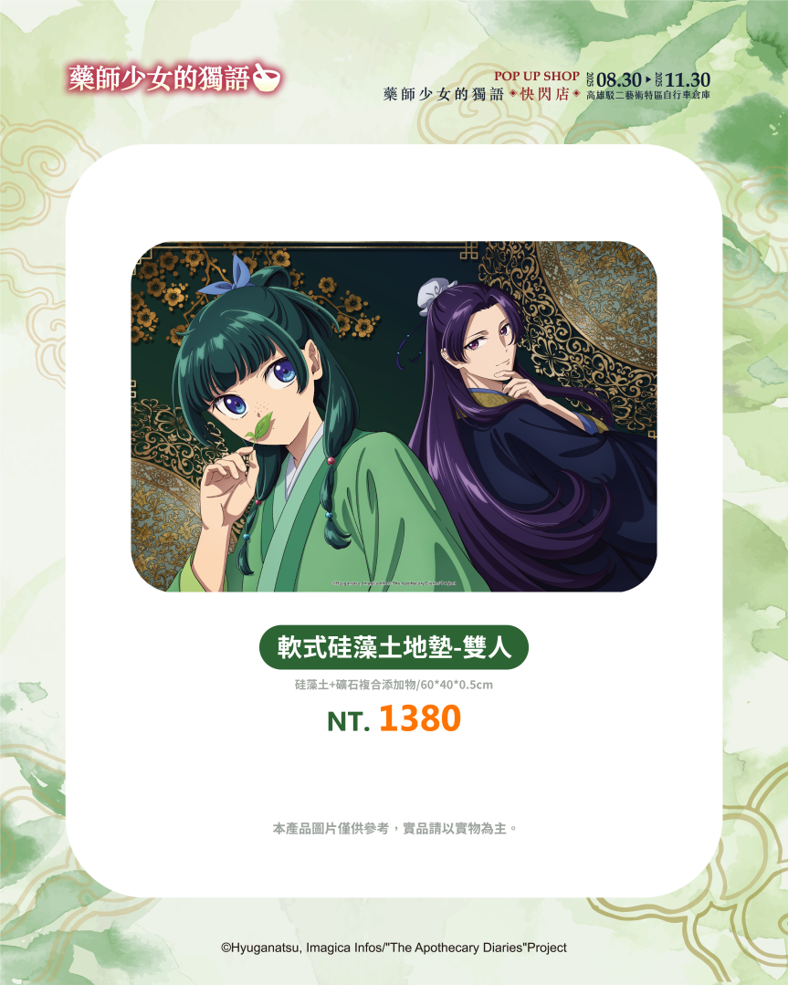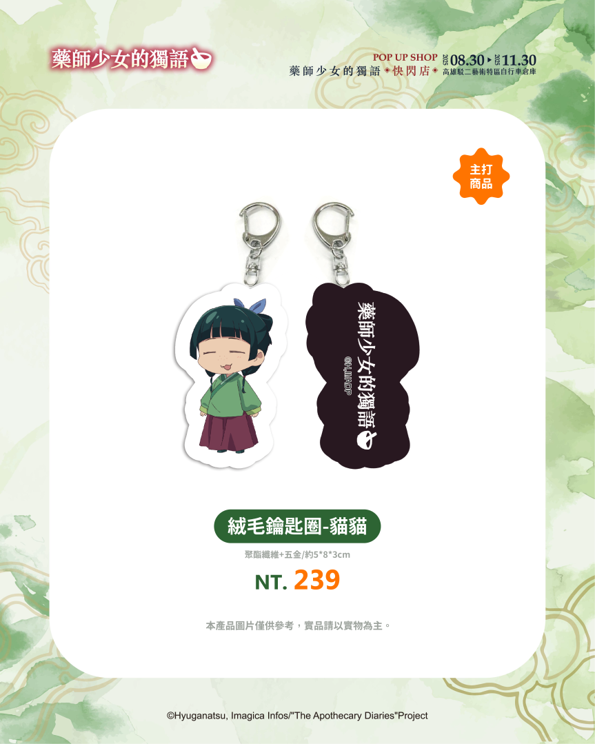 喜歡實用小物的粉絲推薦購入抱枕、硅藻土地墊、杯墊與洗漱墊,讓家裡全部都是《藥師少女的獨語》的身影,而書桌上也絕對要有滑鼠墊與資料夾,讓貓貓陪伴你的日子更精彩!甚至能隨身攜帶的壓克力吊飾、扭蛋隨身鏡與絨毛鑰匙圈,都能在這裡找到!