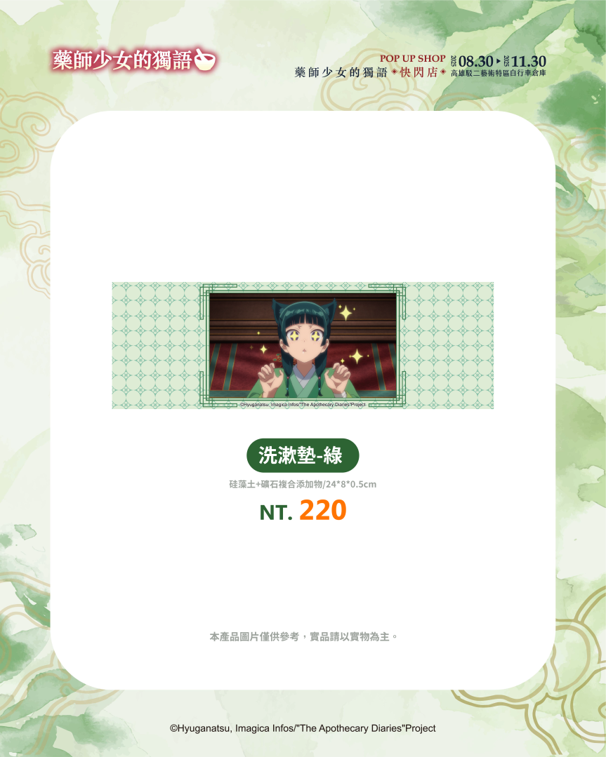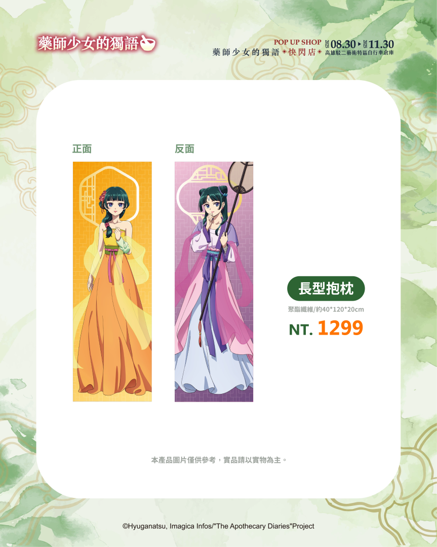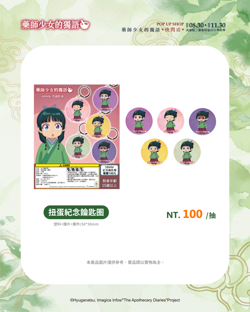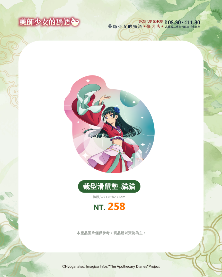 超人氣動畫《藥師少女的獨語》快閃店即將在高雄駁二特區自行車倉庫登場!充滿宮鬥元素的《藥師少女的獨語》憑藉著解謎吸引人一步一步看下去的故事情節,以及貓貓與壬氏的角色魅力掀起全球熱潮。