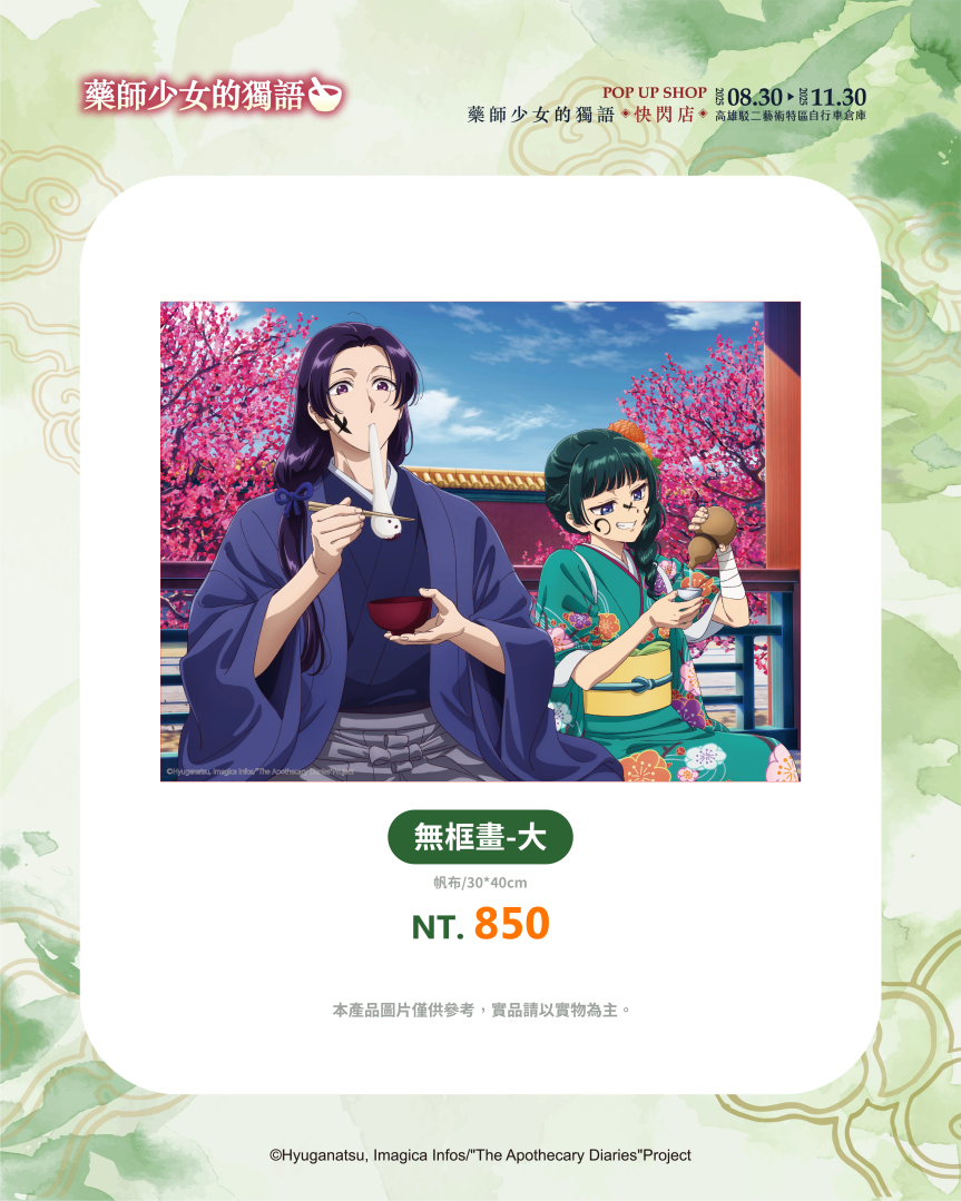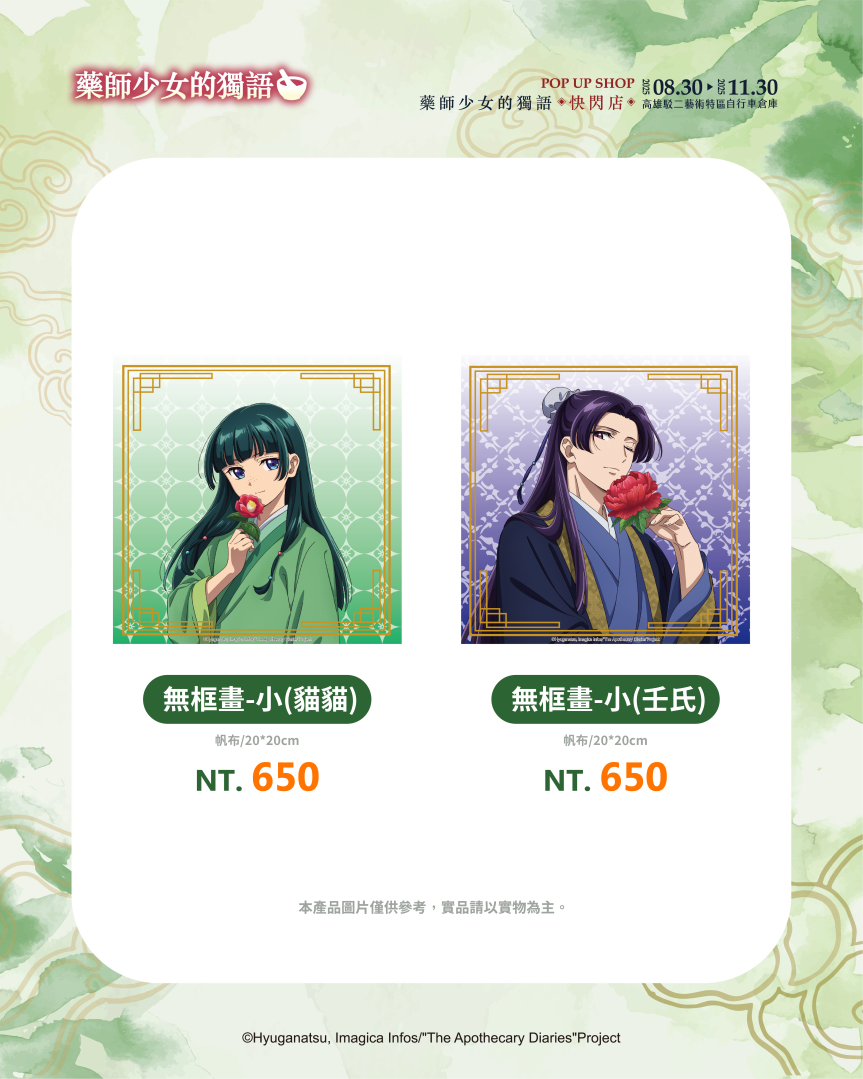 喜歡收藏的粉絲,千萬別錯過貓貓與壬氏的塑膠海報,無論是主視覺圖兩人身影交錯超經典,還是一起寫下七夕許願紙條的圖片,都值得擁有!各種無框畫,無論是角色單人照或是兩人一起俏皮互動的無框畫,千萬別錯過!