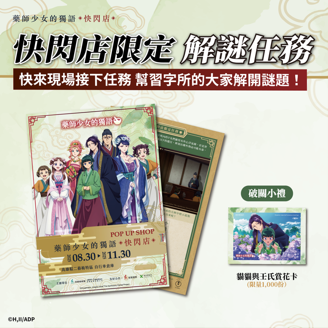 此次由「回歸線娛樂」與「金儀創意」一起合作舉辦的《藥師少女的獨語》快閃店將於 8 月 30 日至 11 月 30 日於高雄駁二特區盛大登場,現場有三大必完成任務!必拍「6大沉浸式宮廷拍照區」3米高貓貓即將降臨快閃店、必買「破百款全新周邊商品」,從收藏海報到實用小物應有盡有。還有必拿的「解謎互動遊戲透卡」與「滿額贈禮」,統整了粉絲來到《藥師少女的獨語》快閃店絕不能錯過的任務,一定要來這場專屬於貓貓與壬氏的宮廷盛會。