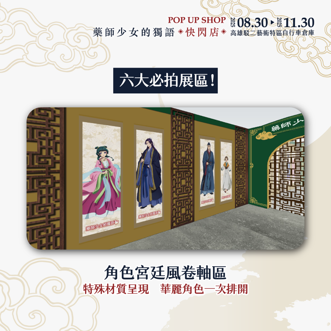 展區入口即是第一大亮點!「華麗宮廷大門」超有氣勢,貓貓與壬氏站在入口迎接大家的到來,走進快閃店首先映入眼簾的是動畫大型主視覺,一整排角色如同親自迎接粉絲到來。第二亮點是「主角圍繞的宮廷椅區」特別設置的宮廷座椅讓大家能與貓貓、壬氏、玉葉妃及高順一同合影,體驗華麗的宮廷氛圍。