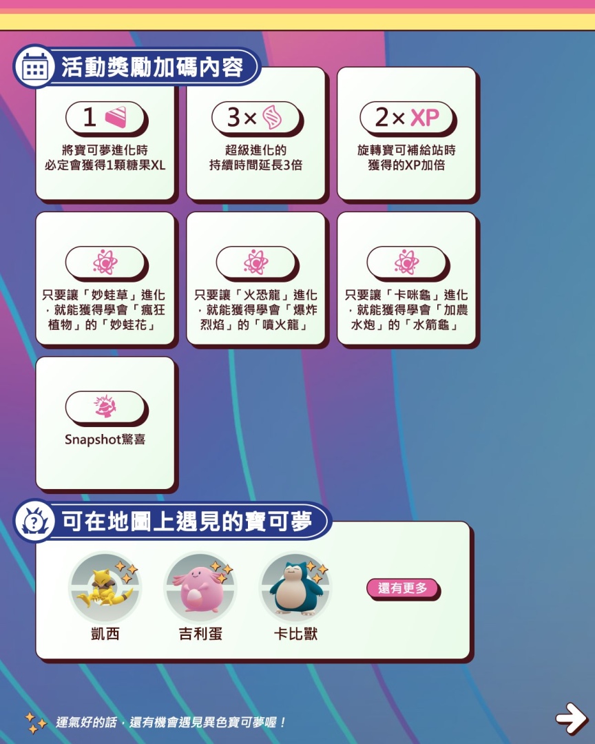 在這次「關都慶典」活動中「吉利蛋」、「卡比獸」與「凱西」等活動主題寶可夢將出現在地圖上!運氣好的話,還有機會遇見異色寶可夢!