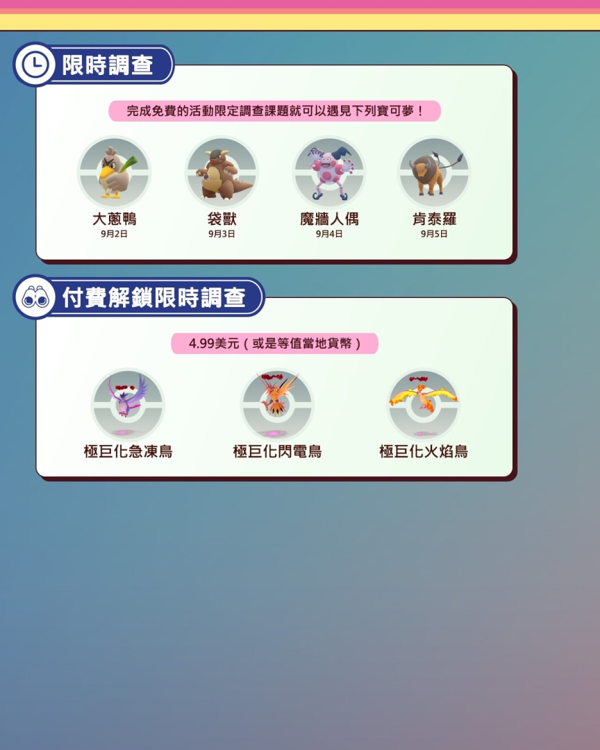免費的活動限定限時調查即將登場!只要完成調查課題就能獲得 XP、星星沙子、超級能量,並遇見來自關都地區,且平常只在特定地區出現的寶可夢!