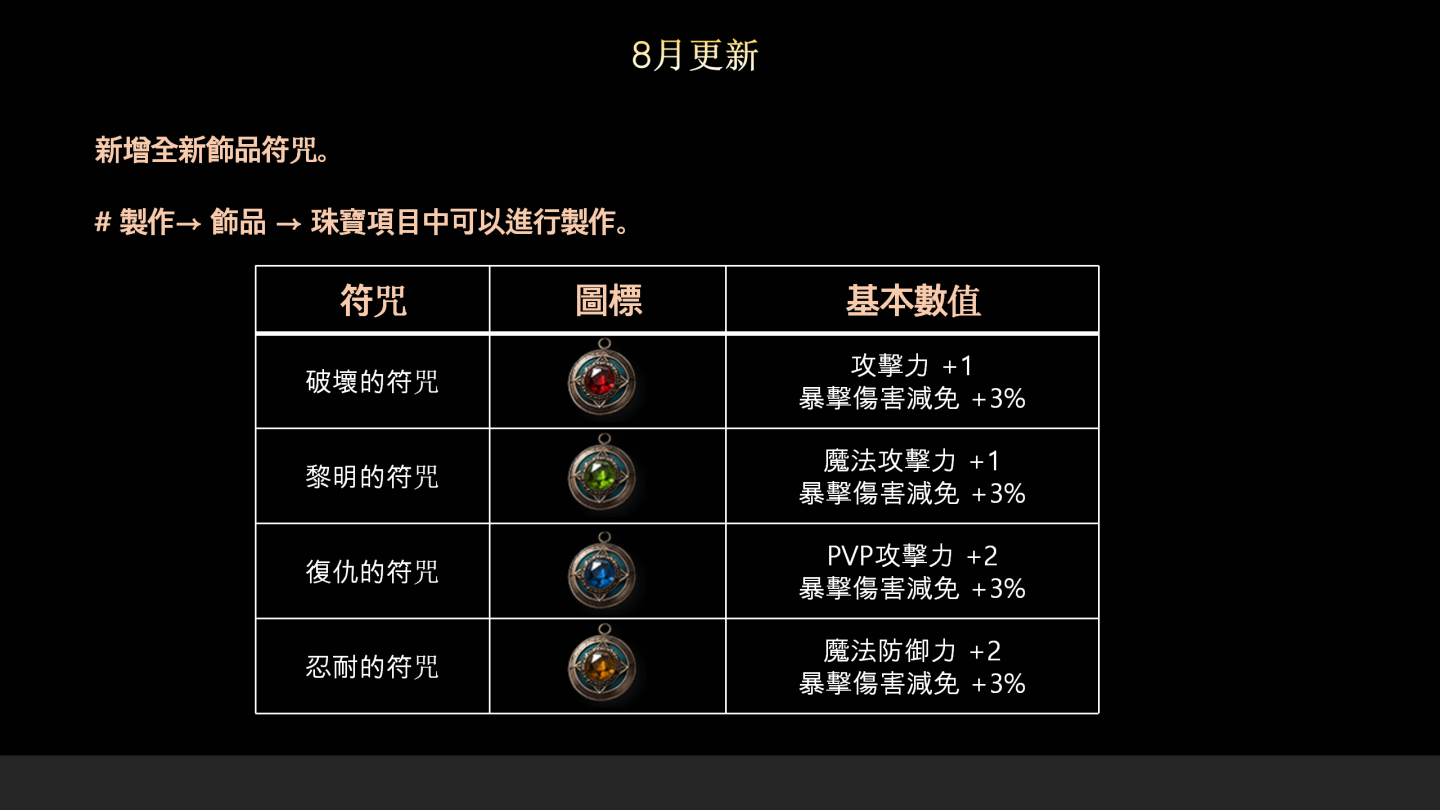 此外,為了強化天選者的戰鬥力,也同步擴充了「特性系統」與新增道具。特性等級上限從 80 擴展至 100 級,並新增全新寶石道具「符咒」,使角色的成長幅度更大。