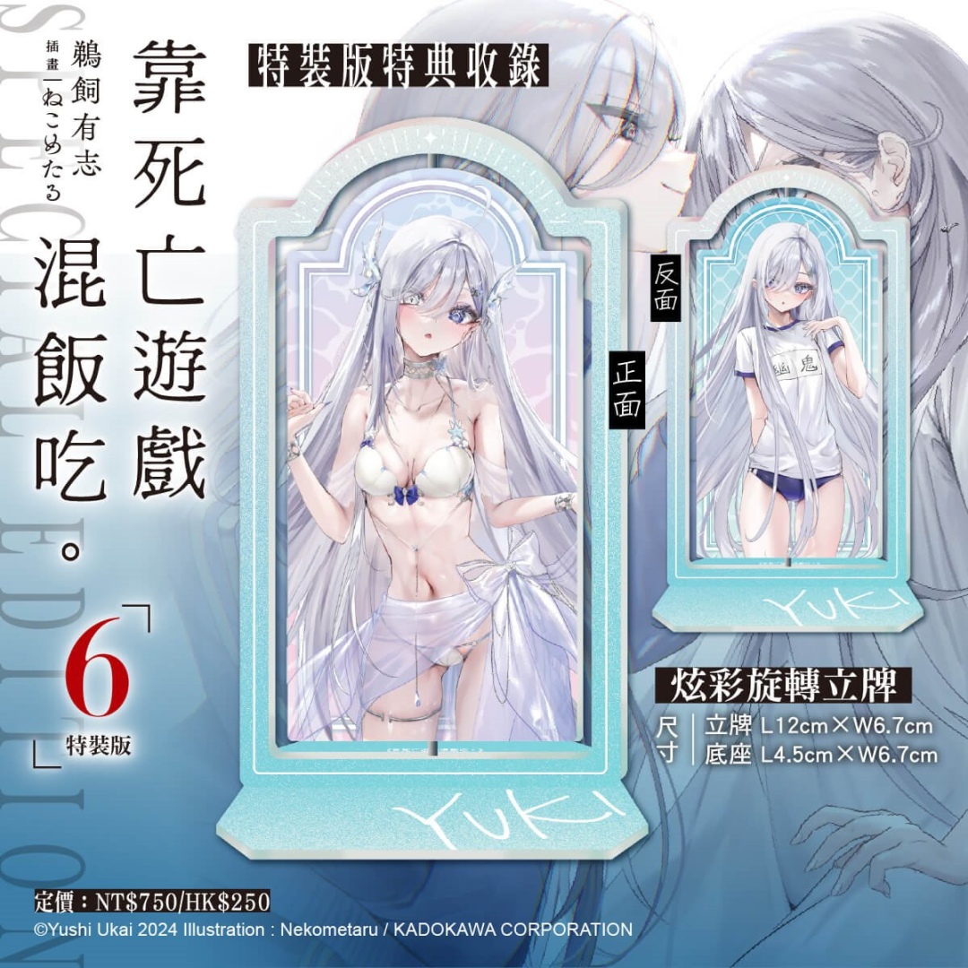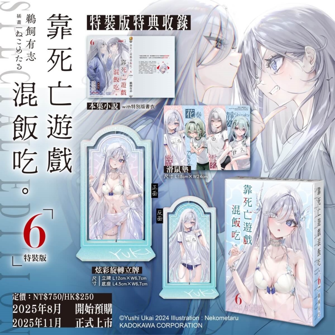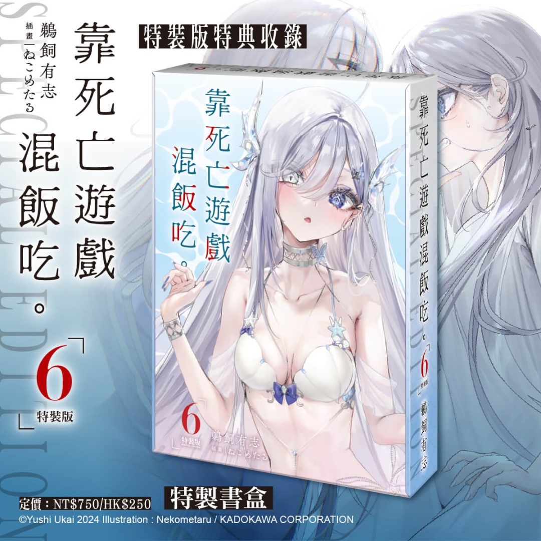 至今已改編漫畫版火熱連載中,更於年初發布改編電視動畫將於 2026 年正式開播!《靠死亡遊戲混飯吃。(6)》以幽鬼清純性感泳裝為主題的絕讚特裝版,將於 11 月同步推出,即日起可至台灣角川官網及各大指定書店通路進行事前限期預購。