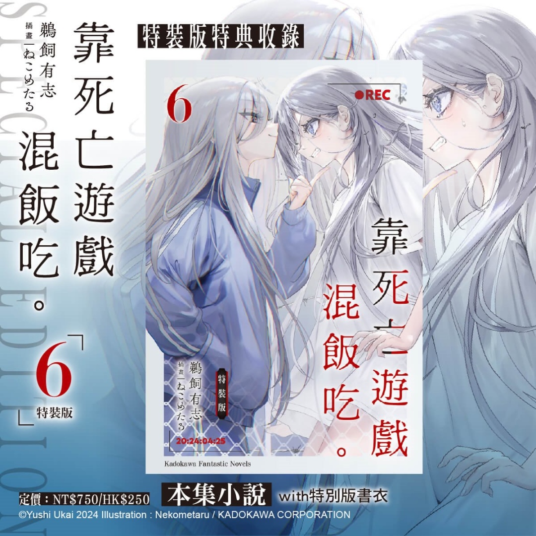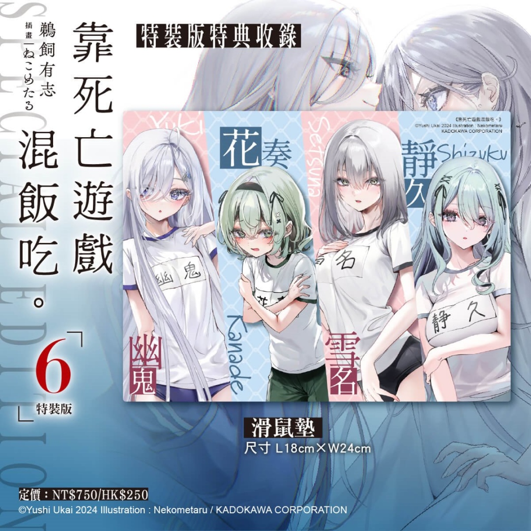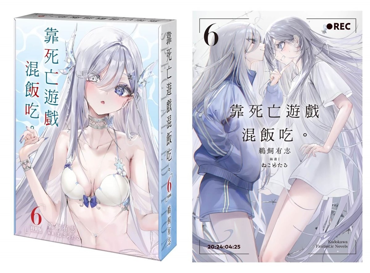 《靠死亡遊戲混飯吃。(6)》我,幽鬼面前,出現了另一個我──普版書封呈現出兩種風格的女高中生主角「幽鬼」形成有趣對比;特裝版以「幽鬼」穿著純慾風白色比基尼泳裝為主題,展現出獨特迷人樣貌!特裝版收錄特典──包含正面呈現泳裝Ver.與反面呈現JK運動服Ver.幽鬼的「炫彩旋轉立牌」、挑戰新一輪遊戲的甜美可愛少女陣容「滑鼠墊」以及「本集小說with特別版書衣」皆收錄於「特裝版特製書盒」。