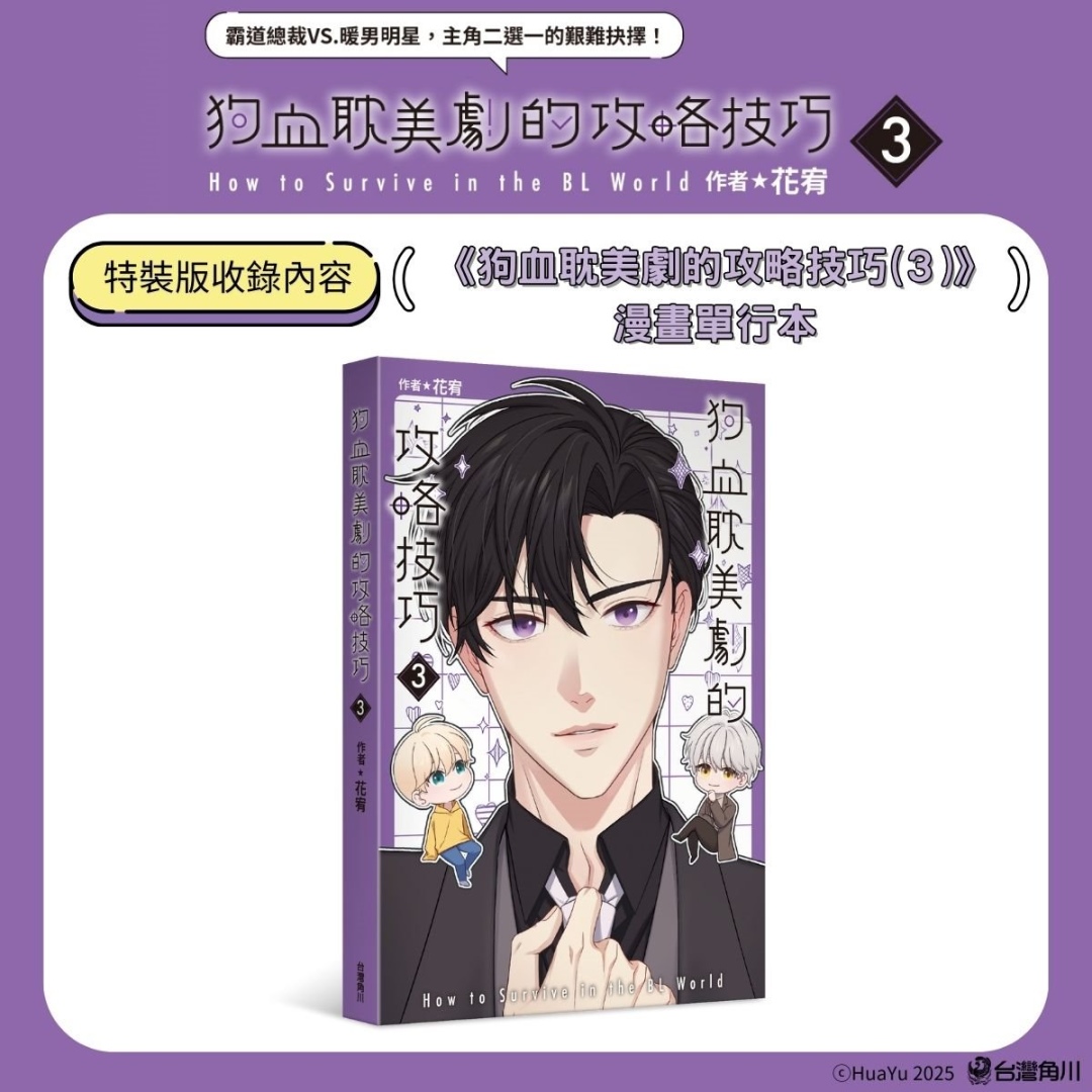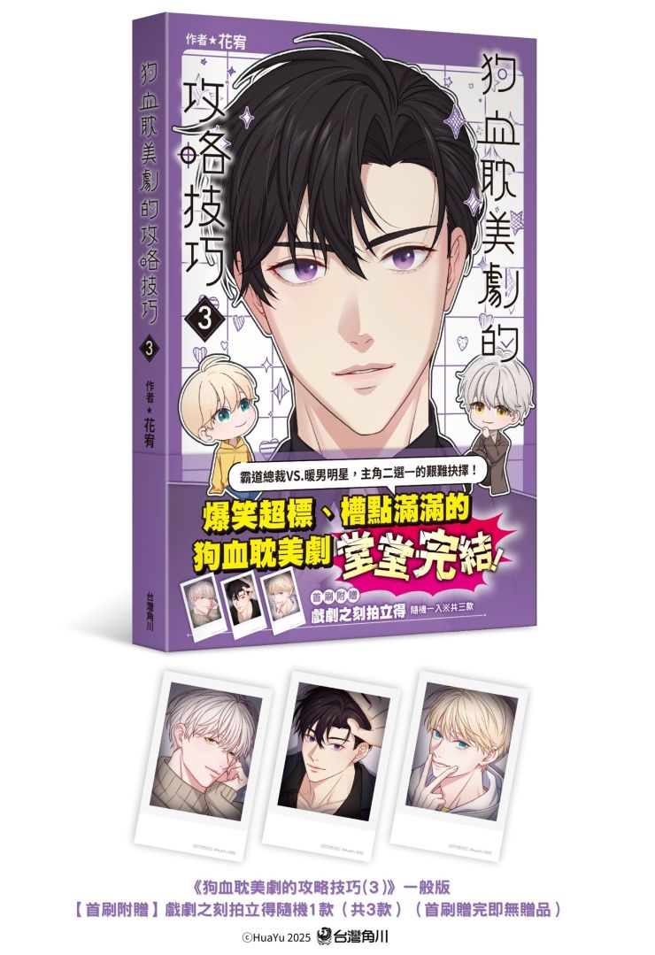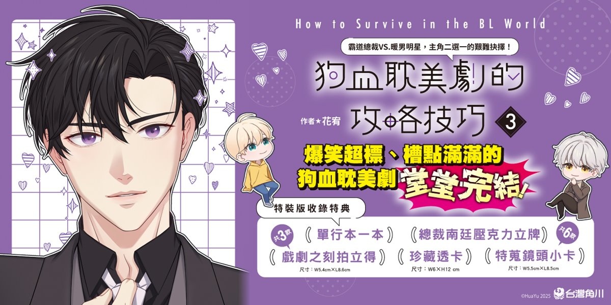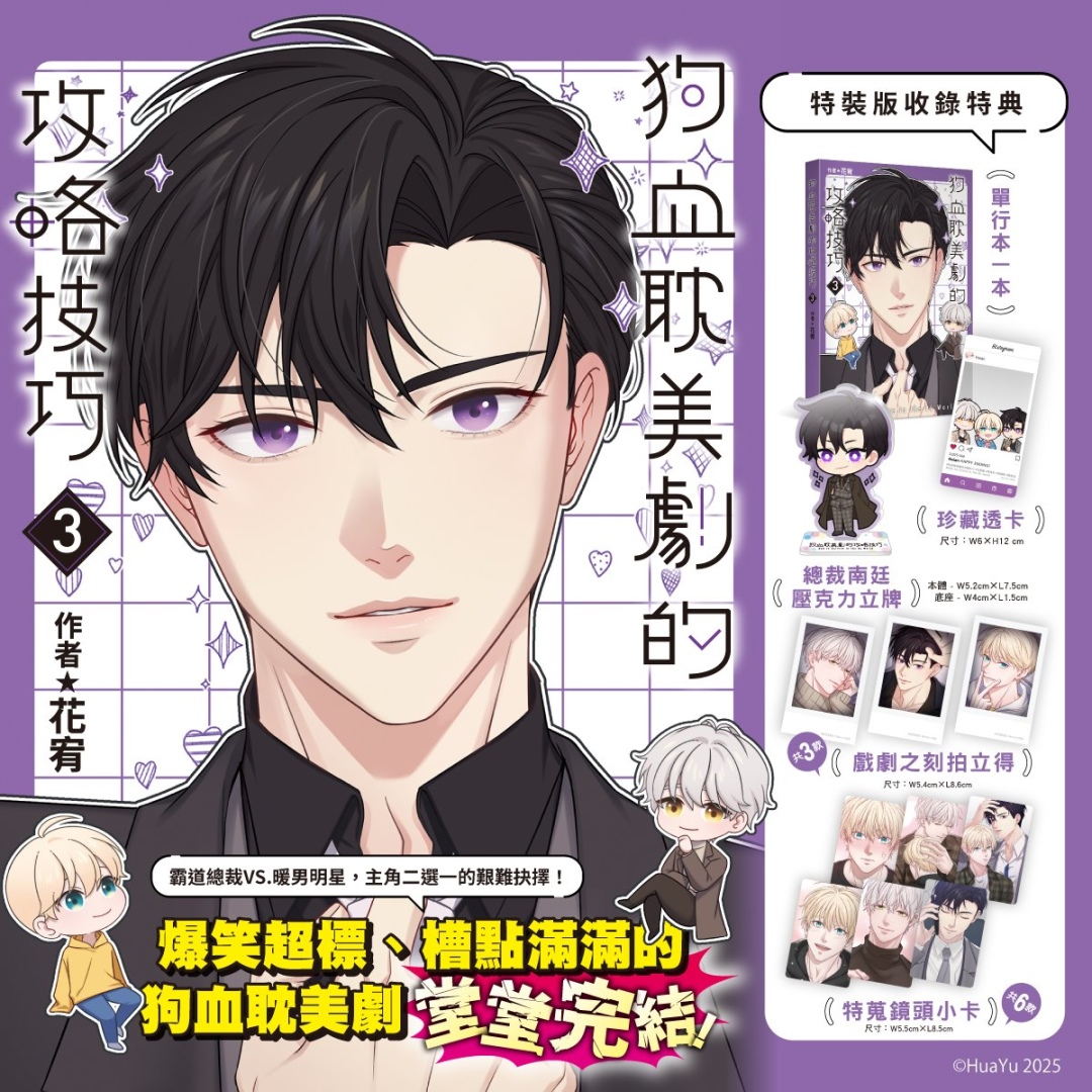 自 CCC追漫台連載以來,本作憑藉獨特的幽默風格與細膩的畫風,吸引大批粉絲追隨。2024 年更授權三點水製藝文化有限公司改編為 2.5 次元真人音樂劇,今年8月舉辦的讀劇演出場場完售、熱烈落幕。9 月 4 日《狗血耽美劇的攻略技巧 (3) (完)》將正式出版,並同步推出特裝版,粉絲將能再次重溫經典「男上加男」的爆笑場景與高潮情節!