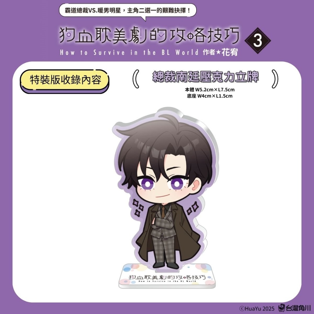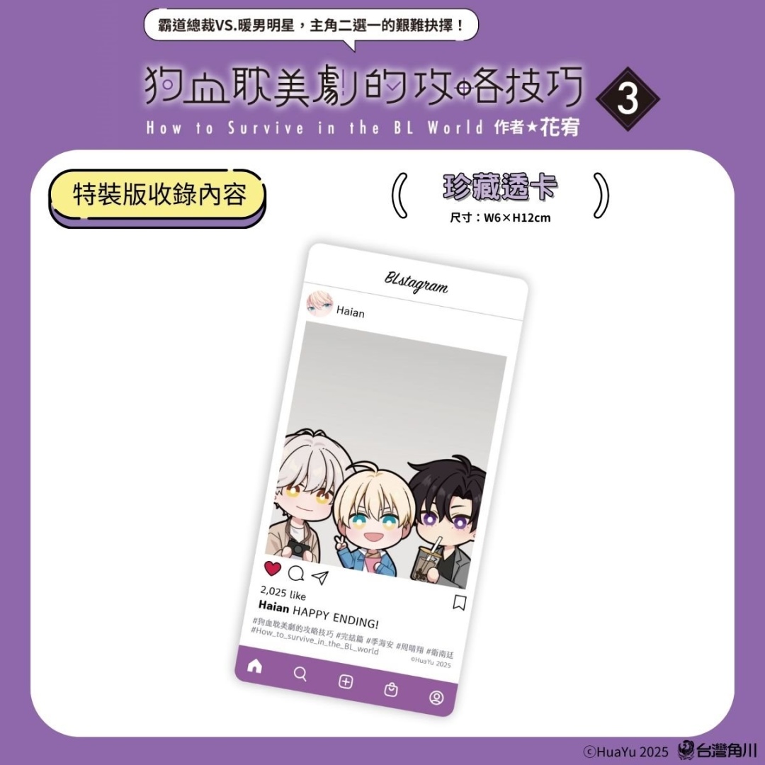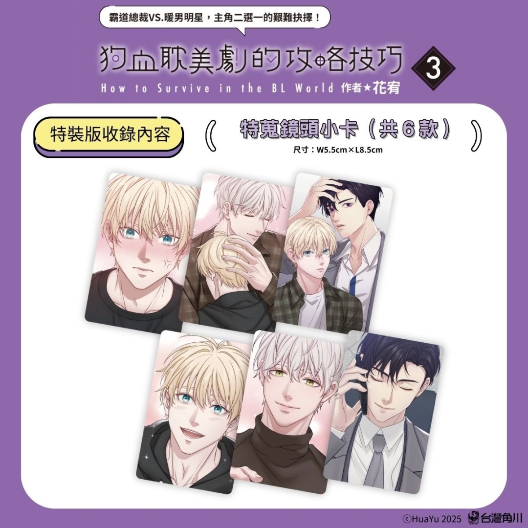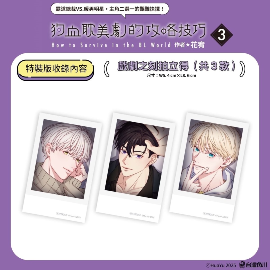 自 CCC追漫台連載以來,本作憑藉獨特的幽默風格與細膩的畫風,吸引大批粉絲追隨。2024 年更授權三點水製藝文化有限公司改編為 2.5 次元真人音樂劇,今年8月舉辦的讀劇演出場場完售、熱烈落幕。9 月 4 日《狗血耽美劇的攻略技巧 (3) (完)》將正式出版,並同步推出特裝版,粉絲將能再次重溫經典「男上加男」的爆笑場景與高潮情節!
