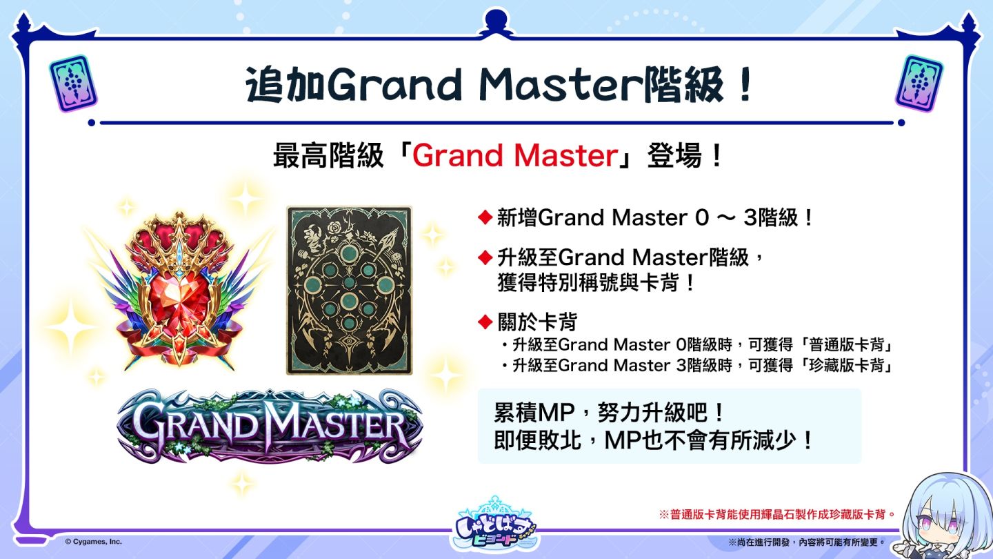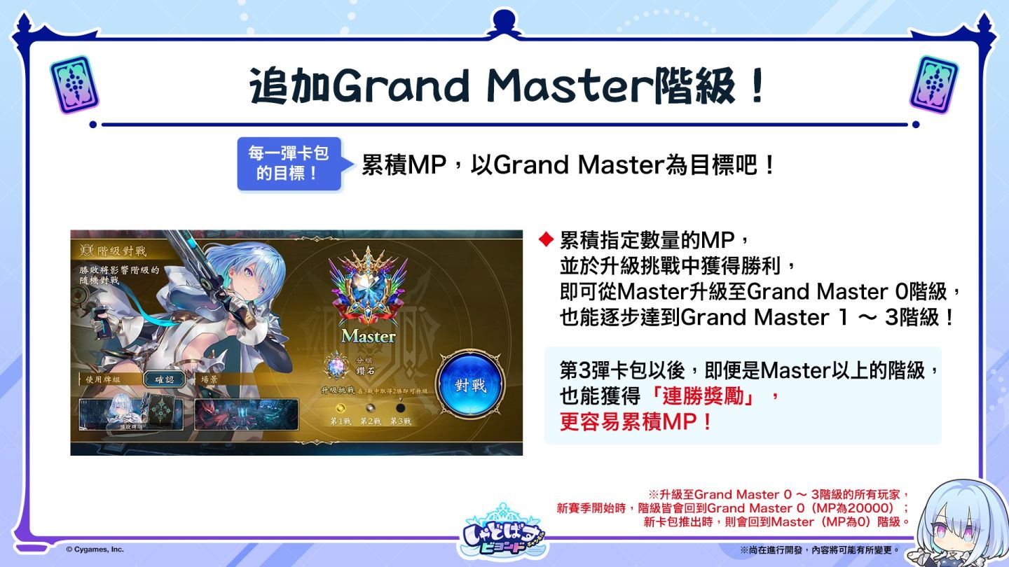 第 3 彈卡包登場後,將追加最高階級「Grand Master」。在 Grand Master 階級中,將依據勝負與對戰表現獲得 Master Point(MP)。