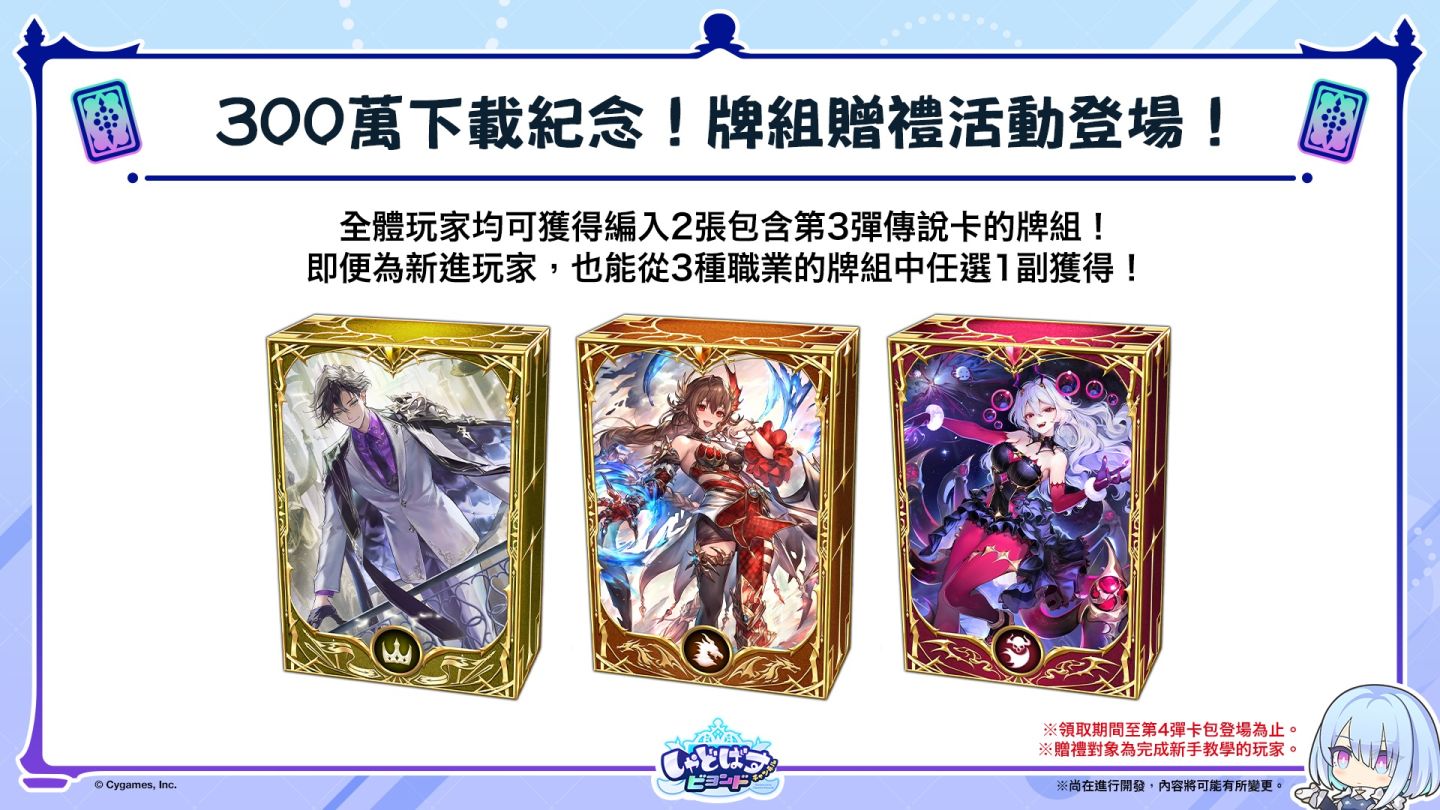 《Shadowverse:Worlds Beyond(闇影詩章:凌越世界)》全世界累計下載人數已突破 300 萬人次。為記念達成此里程碑,將舉辦向全體玩家贈送牌組的特別活動。於本活動內,可從全 3 種牌組中任選 1 副喜愛的牌組。