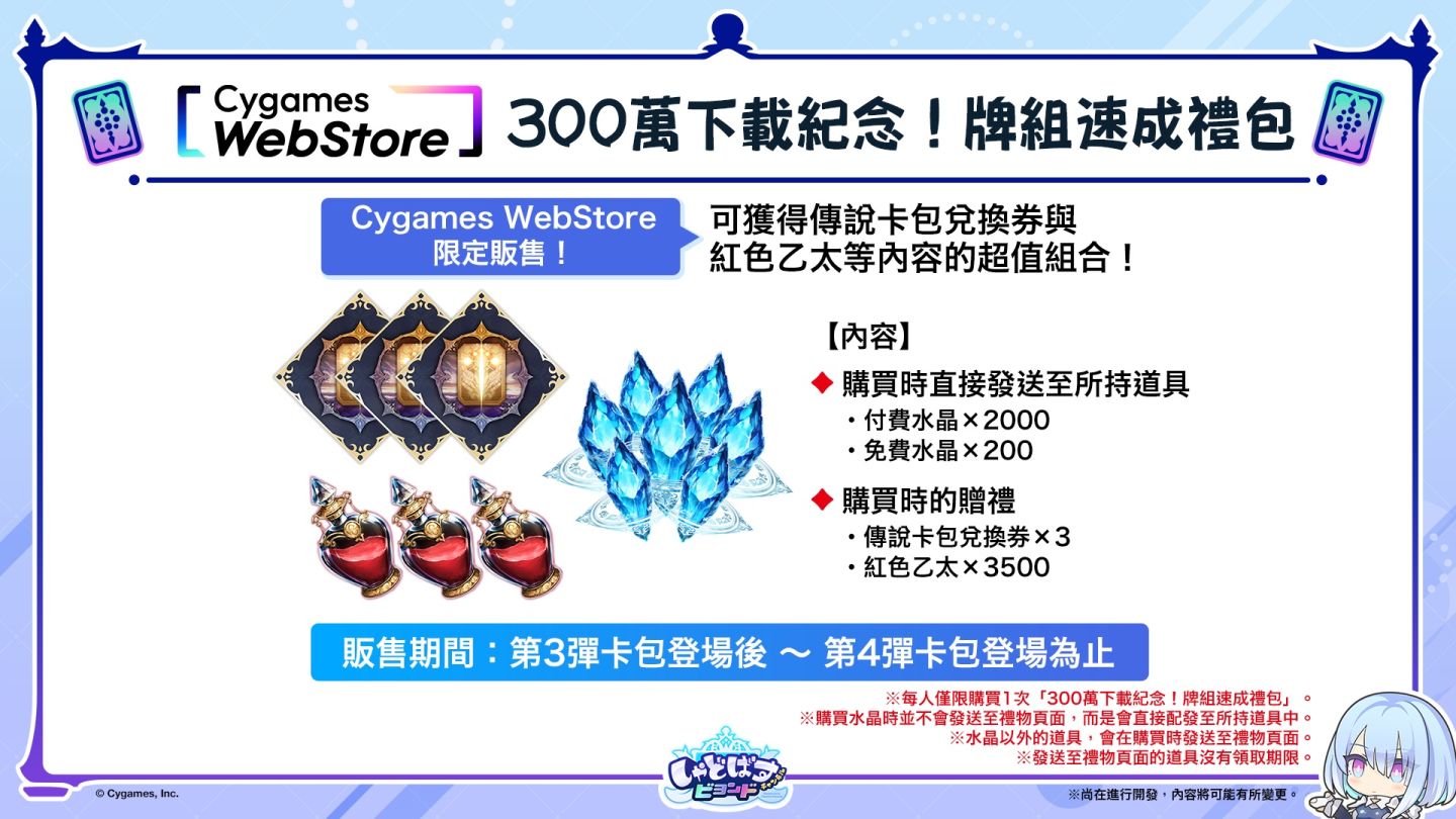 為記念突破 300 萬人次下載,將於 Cygames WebStore 獨家販售內含超值水晶的「300 萬下載紀念!牌組速成禮包」。本商品每人限購 1 組。