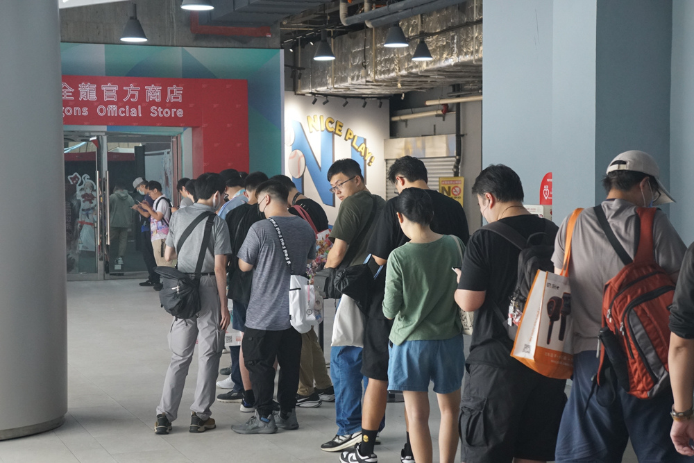 周邊商品專區下午湧現排隊人潮。本次聯名周邊商品種類豐富,涵蓋了聯名球衣、T恤、應援毛巾、抱枕、吊飾娃娃、鑰匙圈、滑鼠墊等,而部分商品如徽章與一卡通僅限實體店面販售。