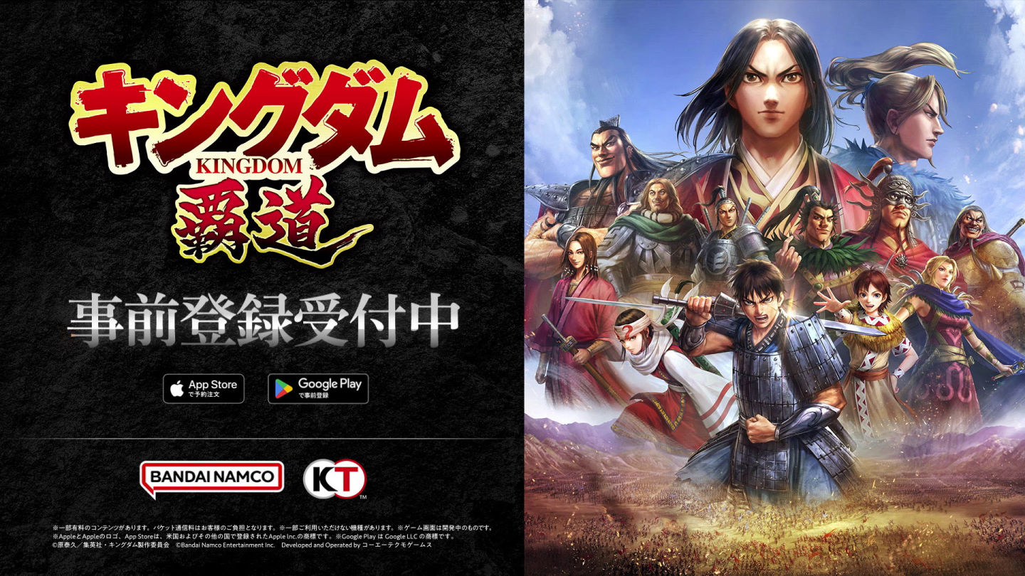Bandai Namco Entertainment 萬代南夢宮娛樂宣佈,預定在手機上推出、以人氣動畫《王者天下》為題材改編的《王者天下 霸道》(キングダム 覇道),自即日起在日本 App Store/Google Play 開放事前預約。