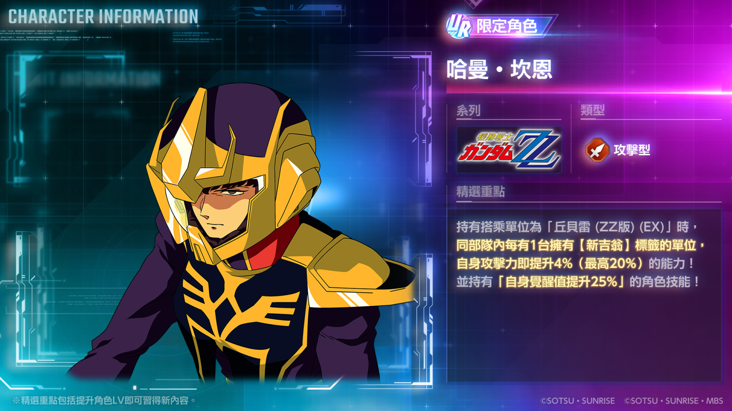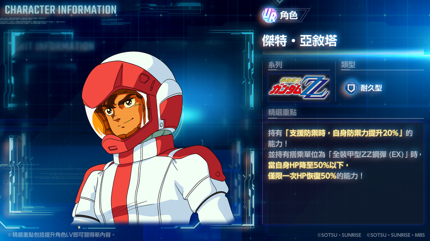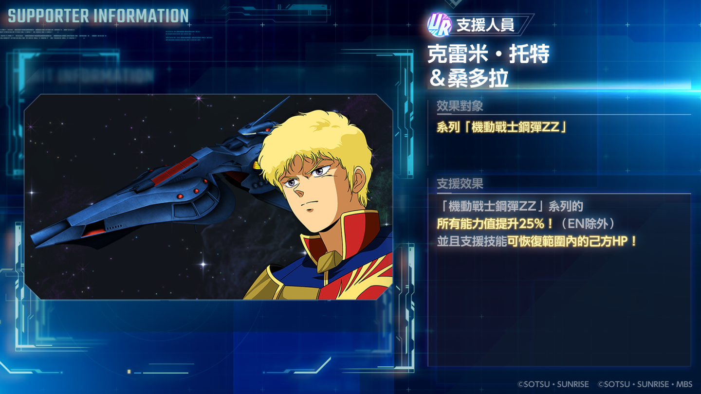 本次精選機體補給中,限期登場的是 UR「丘貝雷(ZZ 版)(EX)」/ UR「哈曼‧坎恩」,以及 UR「全裝甲型 ZZ 鋼彈(EX)」/ UR「傑特‧亞敘塔」等強大陣容。 UR 支援人員「克雷米‧托特&桑多拉」也一同亮相。這些機體補給預計登場至 9 月 22 日 10:59(GMT+8)為止,詳情可至遊戲內查看。