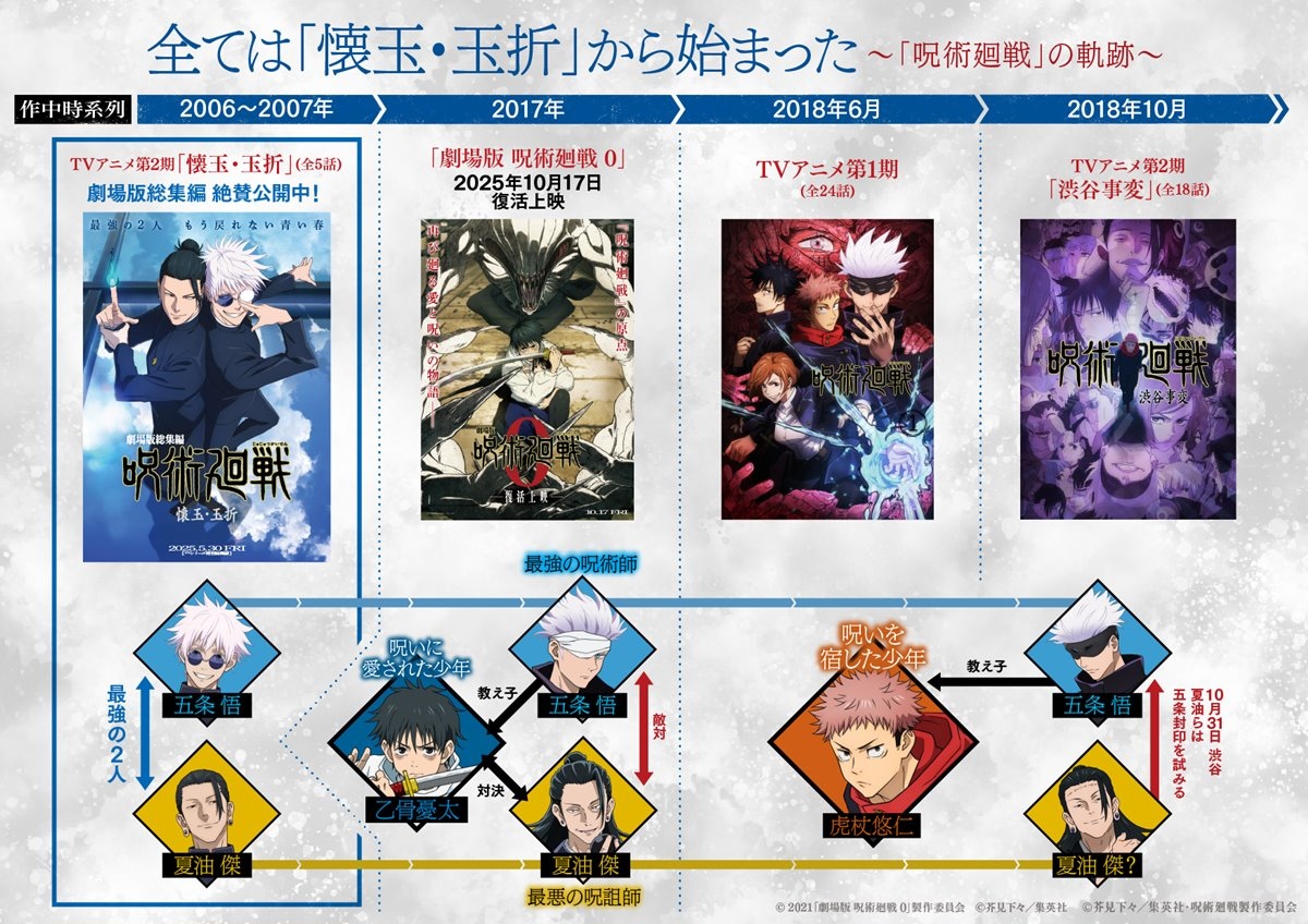 9 月 5 日打頭陣的是五條悟與夏油傑在高專時期的故事:《劇場版 咒術迴戰 懷玉玉折》,故事設定在 2006 年,二年級生的五條悟與夏油傑奉命保護一位名為天內理子的少女,她體內的「星漿體」讓她背負每 500 年與天元大人同化的宿命,藉以維持咒術界的恆久穩定,任務中,自信滿滿的兩人遭遇殺手伏黑慎爾的伏擊,伏黑慎爾不僅威脅了護衛任務的執行,更徹底顛覆兩人的信念與命運,讓兩人從此走上不同的道路。