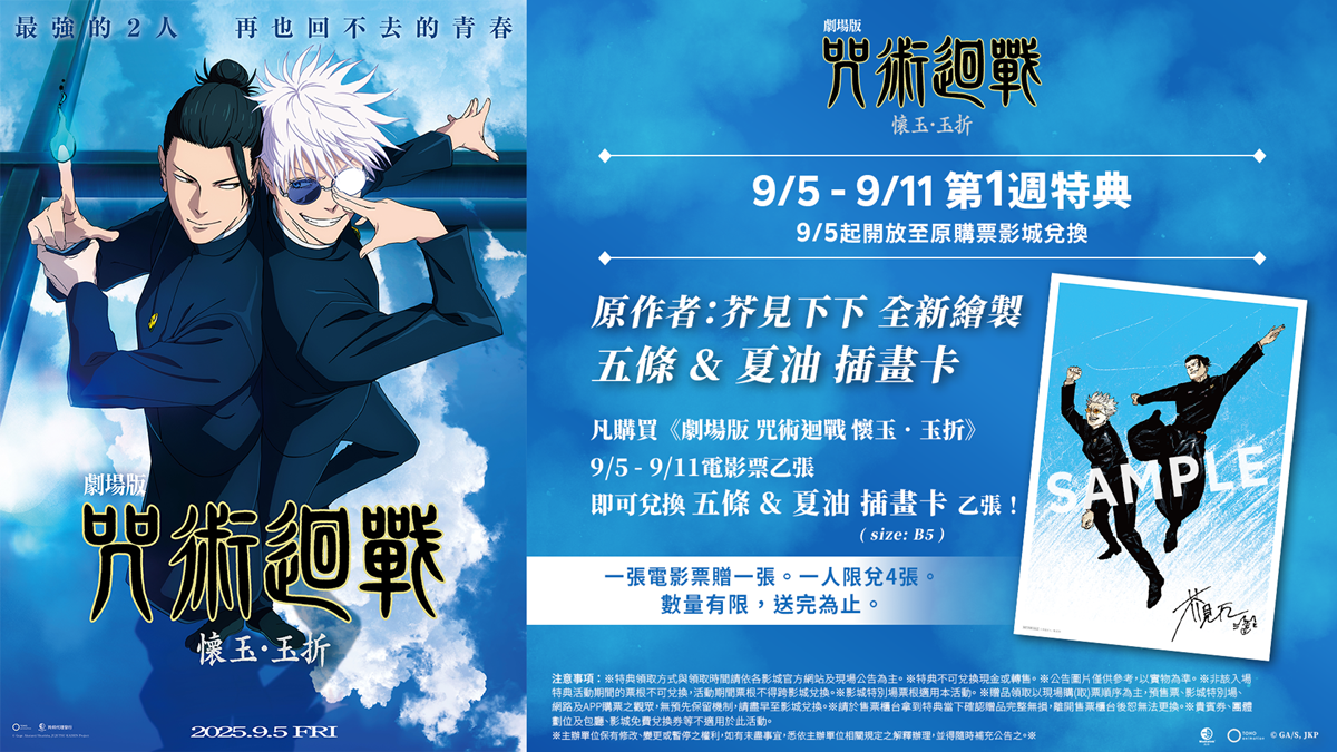 9 月 25 日上映的《劇場版 咒術迴戰 懷玉‧玉折》首週(9/5-9/11)特典推出由原作者芥見下下全新繪製的五條&夏油的插畫卡,凡於期間購買《劇場版 咒術迴戰 懷玉‧玉折》電影票即可兌換 B5 大小的插畫卡乙張,一張票贈一張,一人限兌 4 張,數量有限,送完為止。