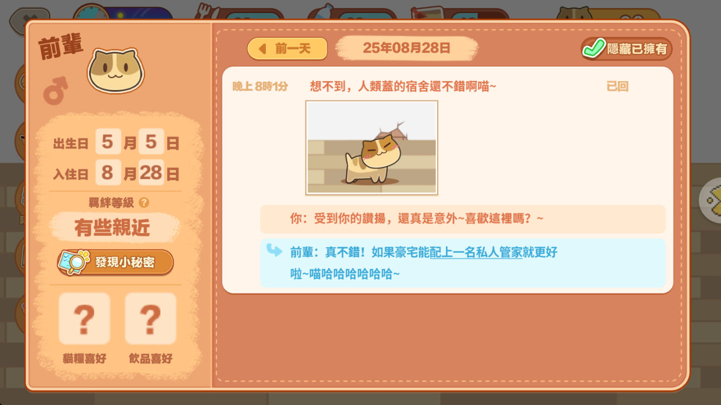 當玩家解鎖特定任務後,即可開啟「貓咪宿舍」功能!在這裡,你能自由裝潢宿舍風格,還能幫貓咪換上各種可愛服裝。在照顧方面,需要購買貓糧、飲用水,定期清理貓砂,還能陪牠們玩遊戲、聊天互動,彷彿真的在線上養一隻貓咪。