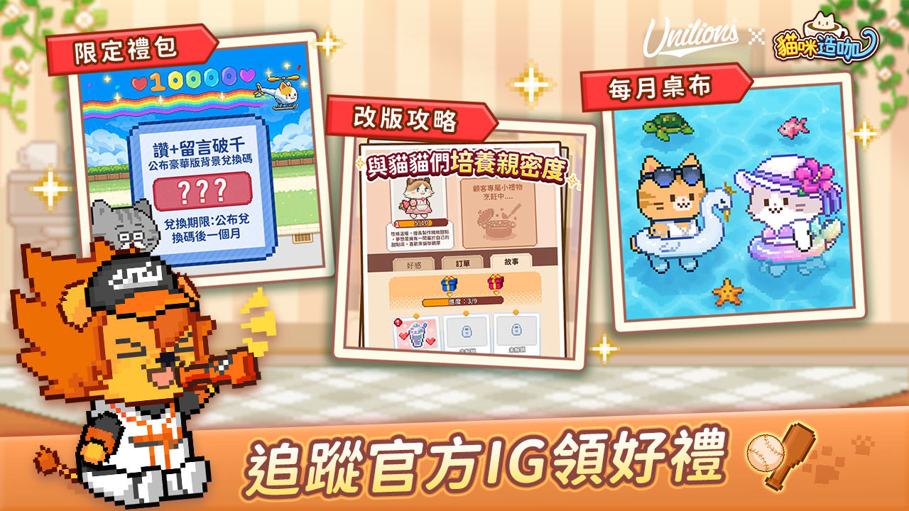 Gamesofa 推出的超療癒像素風模擬經營遊戲《貓咪造咖》,今年 9 月迎來重磅聯動活動,與棒球台灣隊長的母球隊「統一 7-ELEVEN 獅」跨界合作。熱情活潑、擁有超高人氣的吉祥物情侶「萊恩」、「盈盈」限時登場!