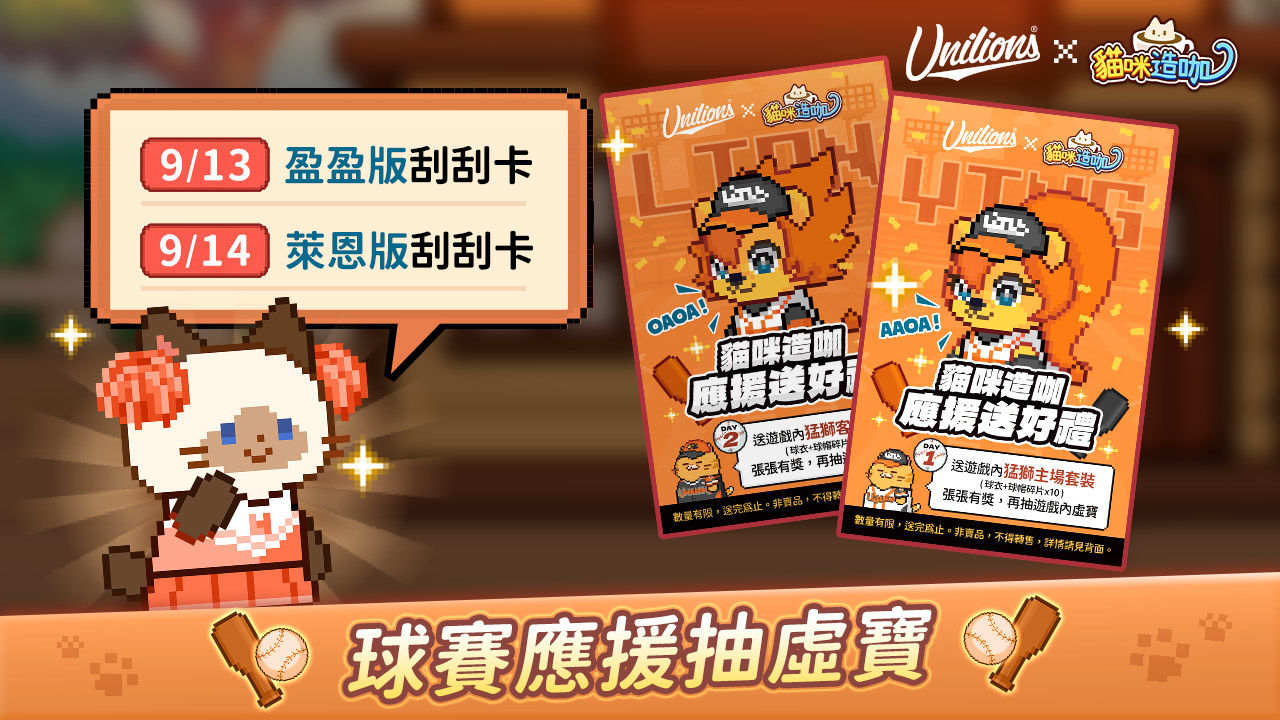別錯過 9/13(六)、9/14(日)於新莊棒球場的主題日精彩賽事,入場球迷可免費領取應援刮刮卡(數量有限贈完為止),刮出遊戲內猛獅球衣及虛寶好禮,讓《貓咪造咖》與你一起跟獅隊吶喊AAOA,狂吼應援!