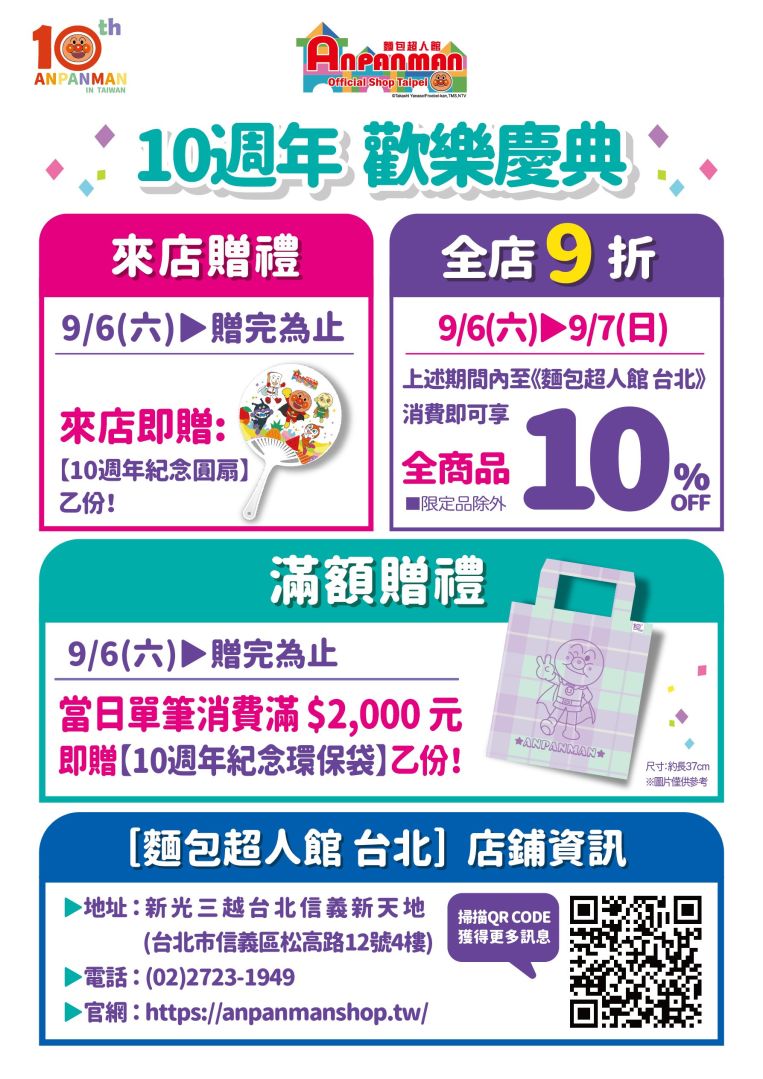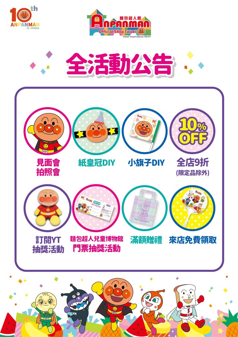 只要到「麵包超人館 台北」店內,就能獲得「十週年紀念圓扇」一份,數量有限送完為止。另外館方更設計「麵包超人拍照會」準備了消費滿額贈禮:單筆消費滿 NT$800 元即可兌換「拍照券」,與麵包超人們合照;至於單筆滿 NT$2,000 元再加碼贈送「十週年紀念環保袋」,限量設計絕對值得收藏。活動兩日,全館商品還享有限時 9 折優惠,是大小粉絲入手麵包超人周邊的最佳時機!