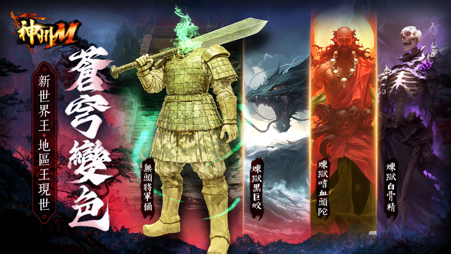 全新地區王「煉獄黑白蛟」、「煉獄嗜血頭陀」和「煉獄白骨精」齊現江湖,令人聞風喪膽、戰雲壓境的全新世界王「無頭將軍俑」,亦隨之破封而出!擊敗無頭將軍俑,便有機會奪得「珍品魔物結晶」、「稀有魔物結晶」、「三轉技能強化卷」和「三轉技能書」等稀世戰利品,在刀光劍影的神州大陸上,鑄就屬於你的武林傳奇!