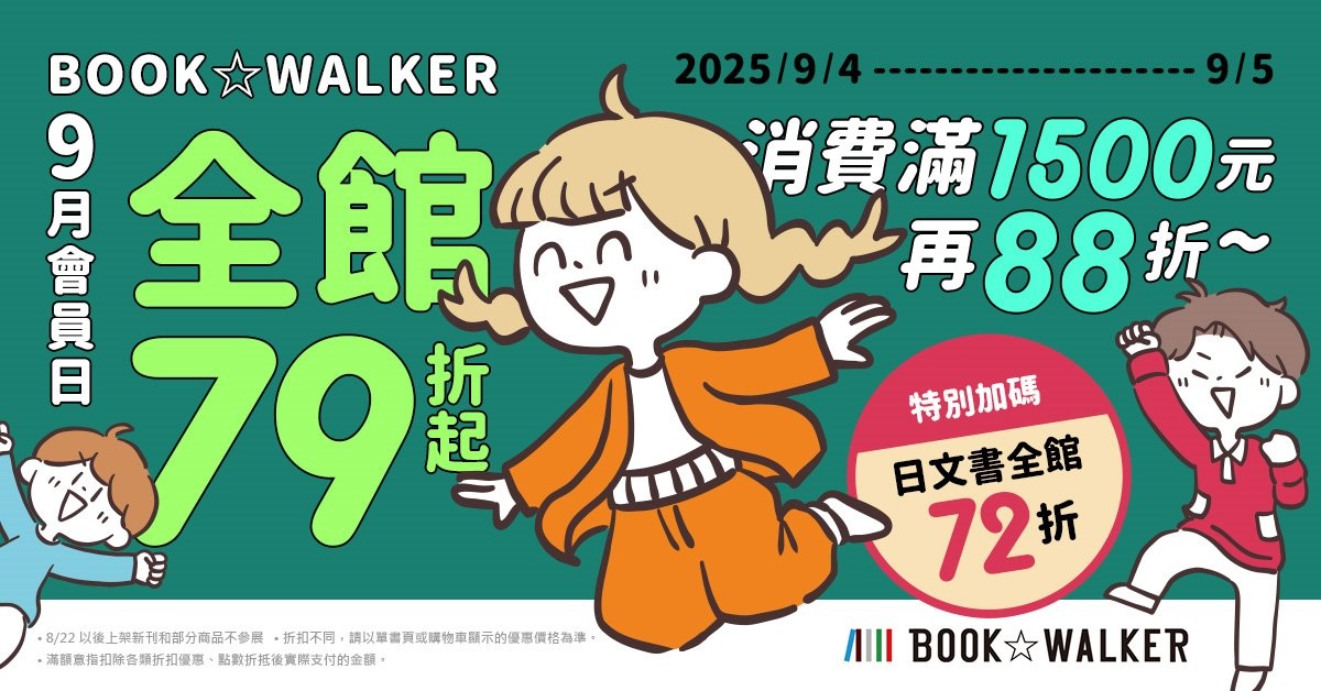 最後是讀者們期待的 BOOK☆WALKER 會員日預告!9 月 4 日至 9 月 5 日,限時兩天,全館優惠 79 折起,單筆消費滿 1500 再享 88 折!日文書更推出全館 72 折,購買日本雜誌、寫真超划算。趁著優惠期間,無痛收藏現象級作品《鬼滅之刃》、精彩夏季動畫原作《Silent Witch 沉默魔女的祕密》、《膽大黨》。還有韓國人氣漫畫新刊《我獨自升級》與魯蛇逆襲的奇幻新作《裝備仔》也不能錯過!馬上打開願望清單,準備清空!