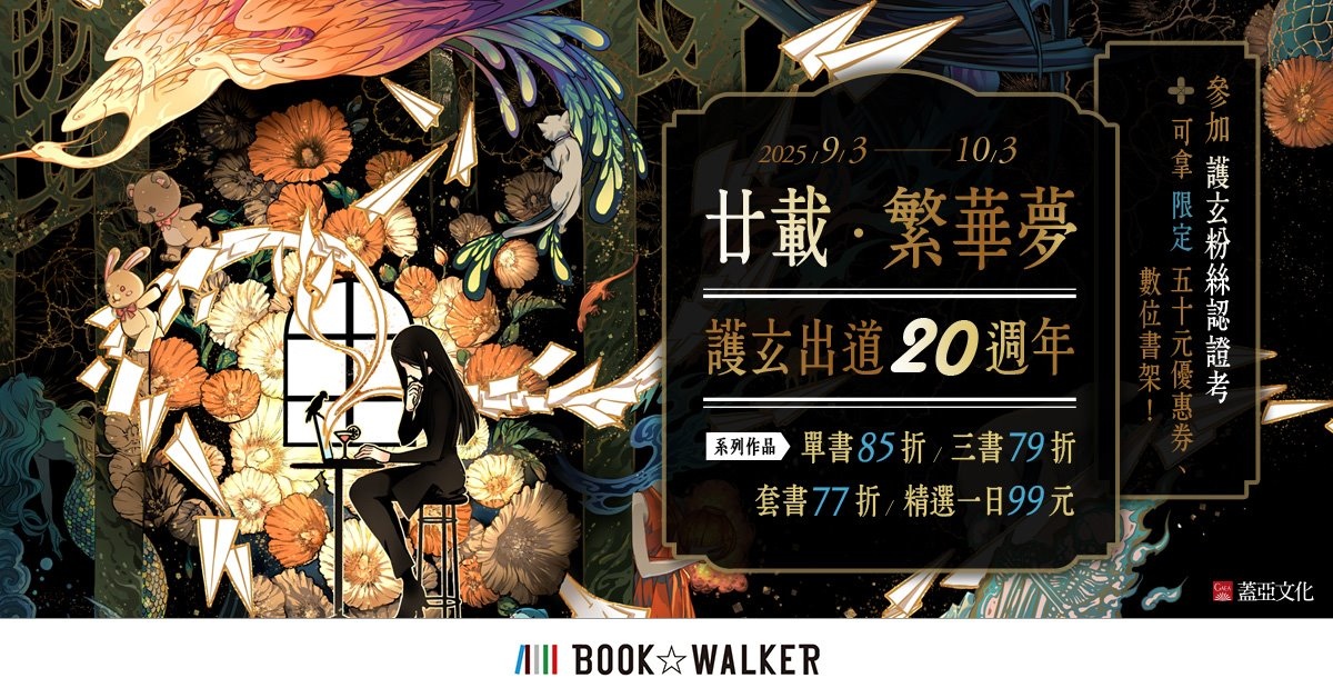 本日注目活動還有「廿載.繁華夢 台灣輕小說家護玄出道 20 週年特別活動」即日起至 10 月 3 日止,護玄系列作品單書 85 折、3 書 79 折,套書優惠 77 折!活動期間首次參加護玄粉絲認證考活動,依答對題數有機會獲得 50 元優惠券與限定書架封面。歡迎書迷們一起來挑戰!
