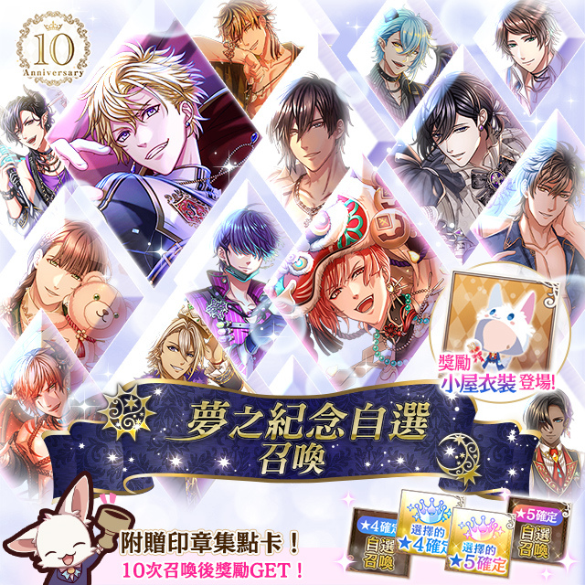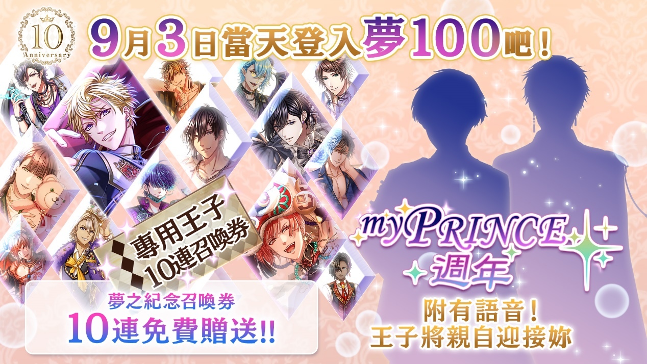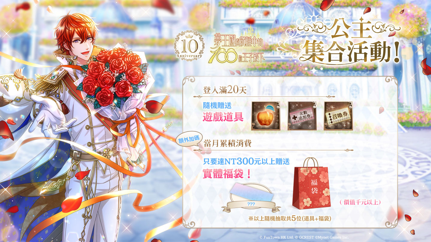 即日起至 2025 年 10 月 3 日,登入《夢100》即可獲得夢之紀念專用王子 10 連召喚券,王子也將親自迎接妳!至 2025 年 10 月 12 日登入遊戲&參與官方社群活動,還有機會免費獲得 10 週年紀念實體商品~壓克力畫框(10 週年主視覺Ver.)。