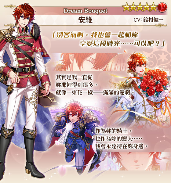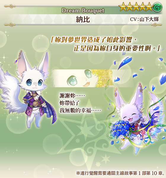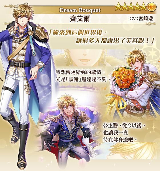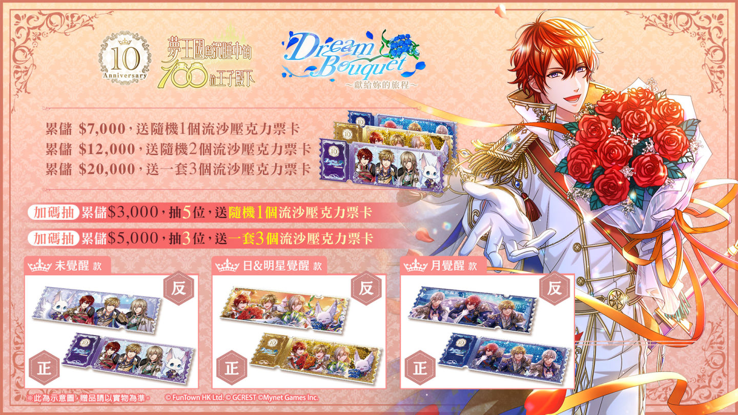 夢谷購物中心開啟超優惠儲值活動,超值禮包販售中!累計儲值達指定金額可獲得愛情突破教育員、10 連召喚券、★5(含 SP)王子自選券等好禮,本次加碼贈送 10 週年紀念「Dream Bouquet」壓克力流沙票卡,共有 3 款絕對都要收集到!
