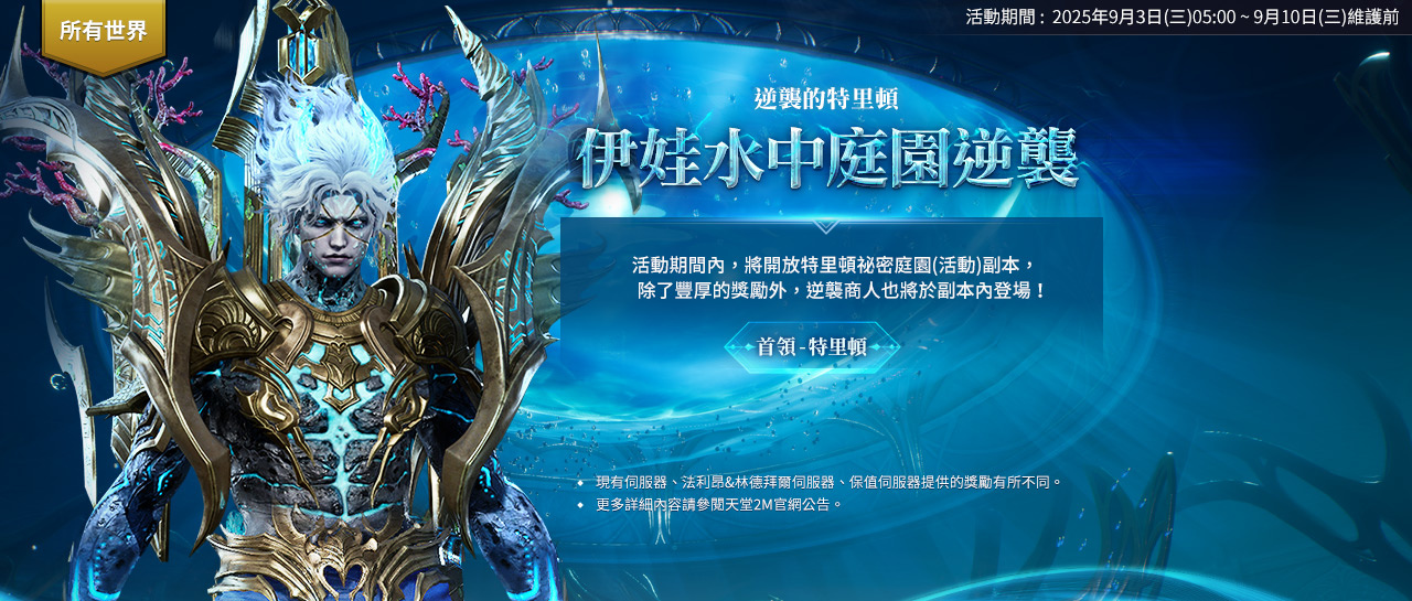 所有世界將進行的「伊娃水中庭園逆襲」活動,將於「特里頓祕密庭園(活動)」副本內進行,開放入場時間為:9/5(五)20:20~22:30,原始世界 65 級以上、保值世界 60 級以上玩家可入場。